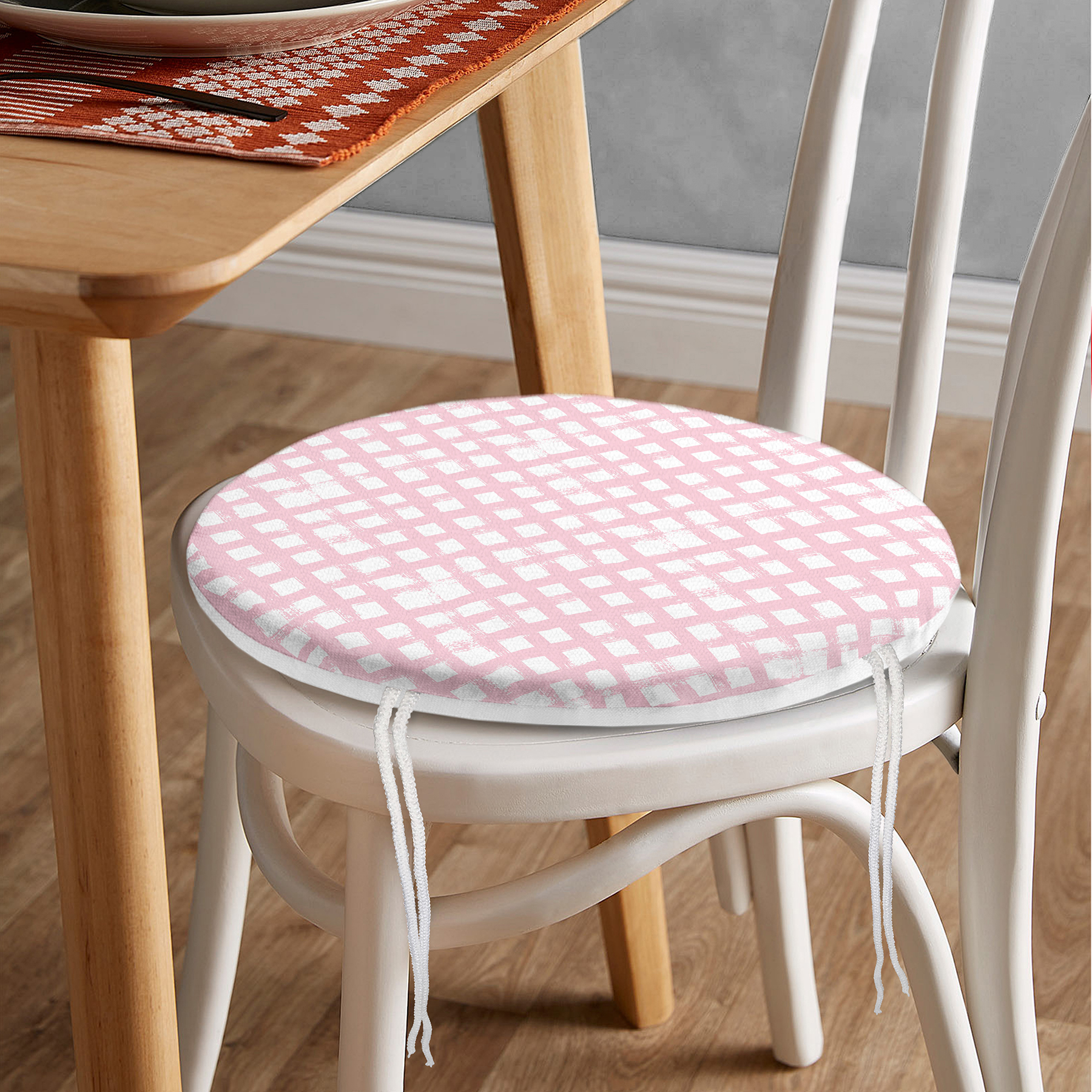 Pembe Zeminde Geometrik Kare Motifli Yuvarlak Fermuarlı Sandalye Minderi Realhomes