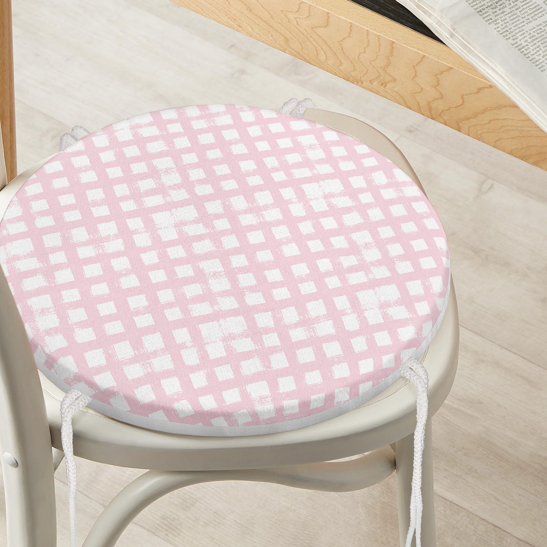 Pembe Zeminde Geometrik Kare Motifli Yuvarlak Fermuarlı Sandalye Minderi