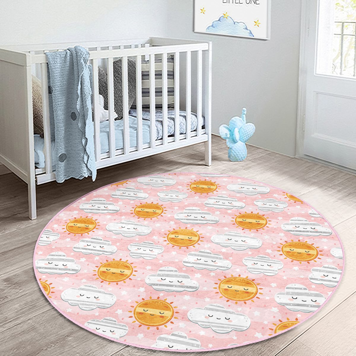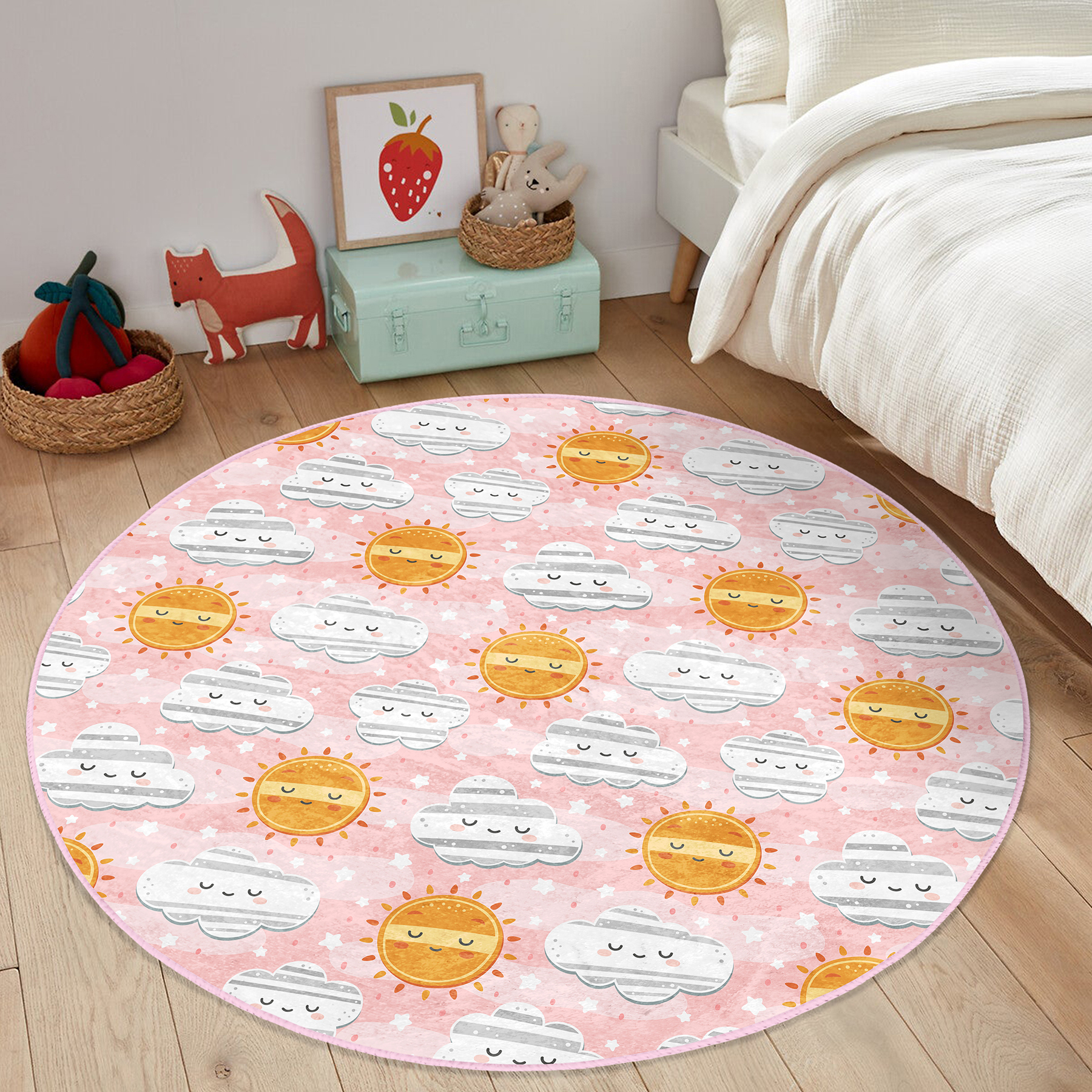 Pembe Zeminde Güneş Ve Bulut Motifli Çocuk & Genç Odası Makinede Yıkanabilir Kaymaz Tabanlı Yuvarlak Çocuk Halısı