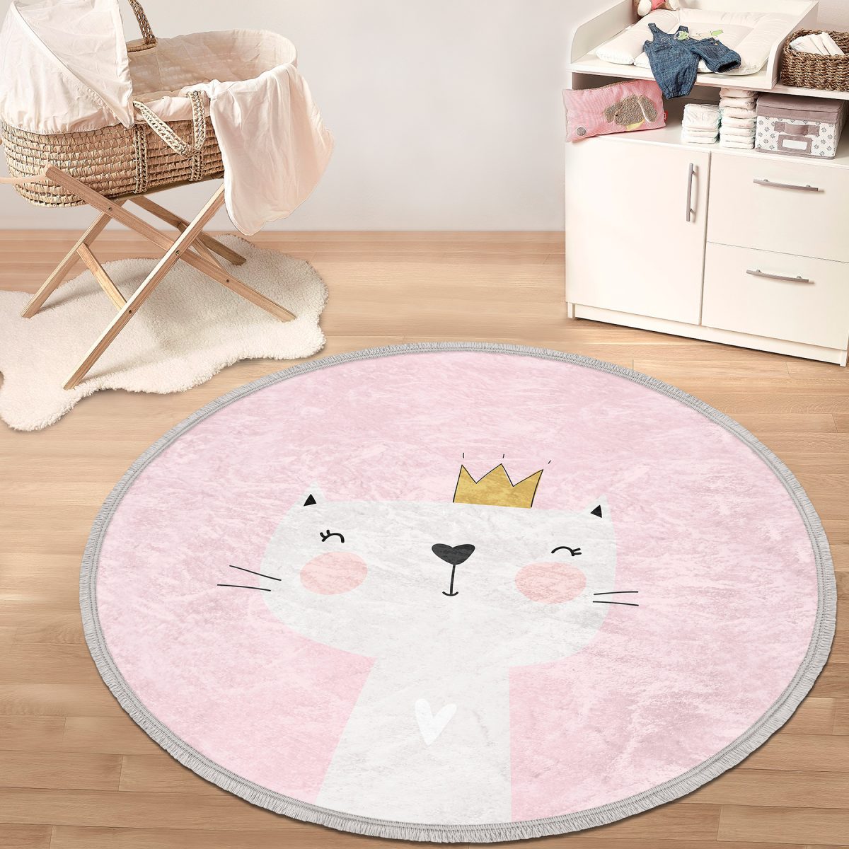 Pembe Zeminde Hello Kedicik Çocuk & Genç Odası Makinede Yıkanabilir Kaymaz Tabanlı Püsküllü Yuvarlak Çocuk Halısı