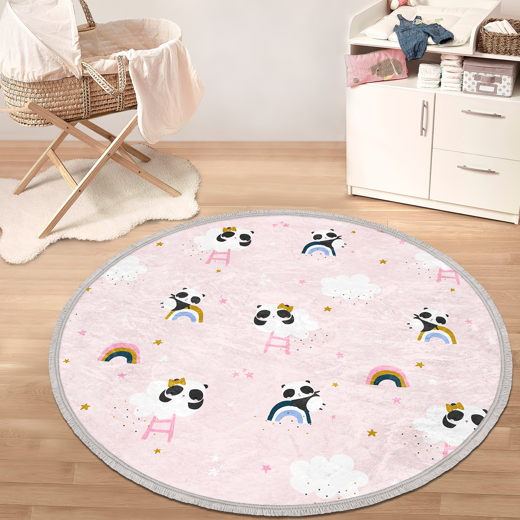 Pembe Zeminde Panda Temalı Çocuk & Genç Odası Makinede Yıkanabilir Kaymaz Tabanlı Püsküllü Yuvarlak Çocuk Halısı