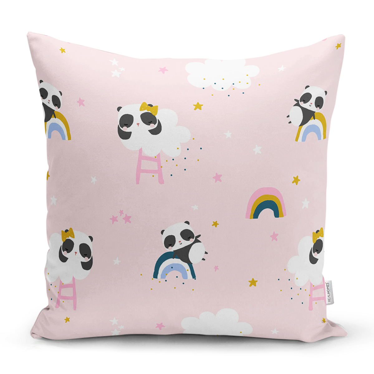 Pembe Zeminde Panda Temalı Dijital Baskılı Özel Tasarım Modern Yastık Kırlent Kılıfı Realhomes