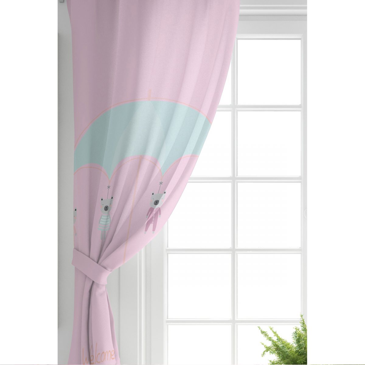 Pembe Zeminde Şemsiye ve Sevimli Ayıcıklar Motifli Bebek Odası Fon Perde