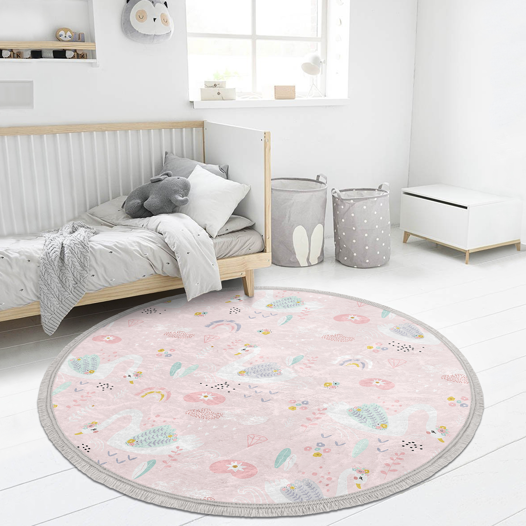 Pembe Zeminde Sevimli Kuğular Çocuk & Genç Odası Makinede Yıkanabilir Kaymaz Tabanlı Püsküllü Yuvarlak Çocuk Halısı