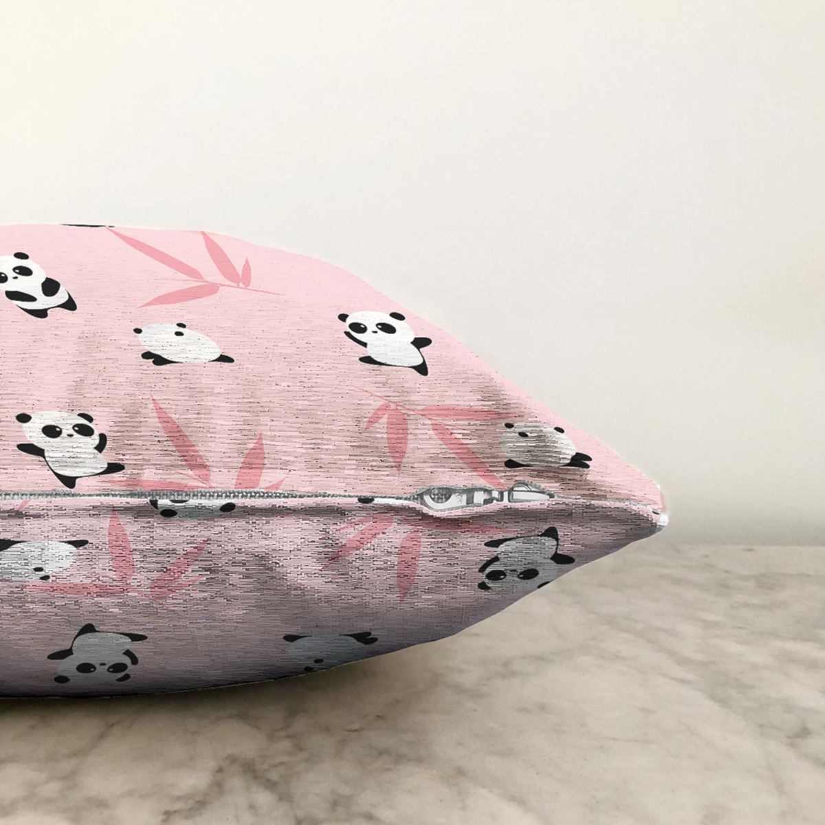 Pembe Zeminde Sevimli Panda Tasarımlı Dijital Baskılı Özel Tasarım Modern Şönil Yastık Kırlent Kılıfı