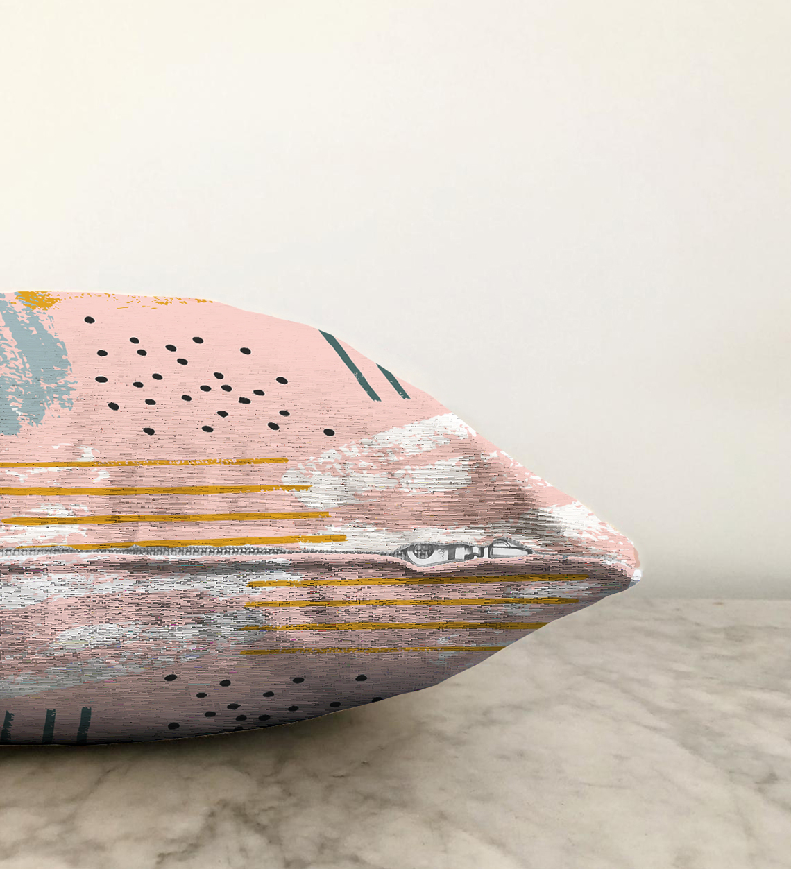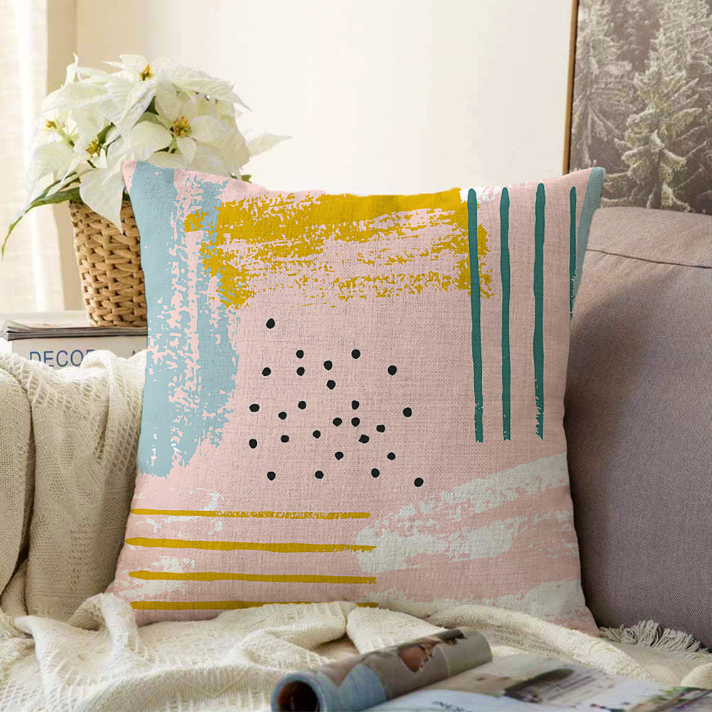 Pembe Zeminde Soyut Sulu Boya Çizimli Dekoratif Raşel Kadife Kırlent Kılıfı