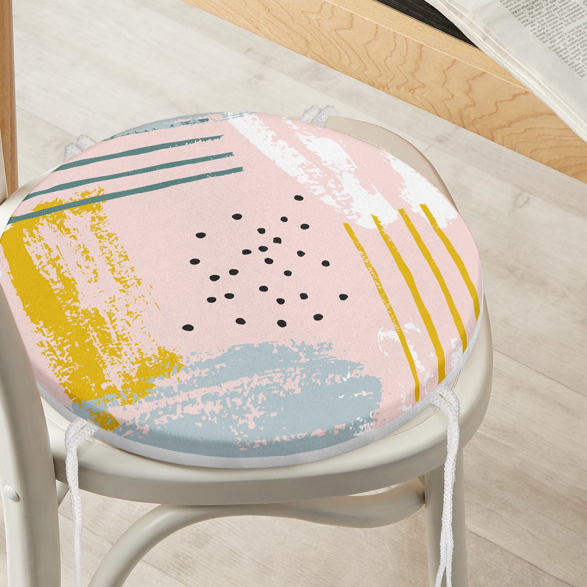 Pembe Zeminde Soyut Sulu Boya Çizimli Yuvarlak Fermuarlı Sandalye Minderi Realhomes