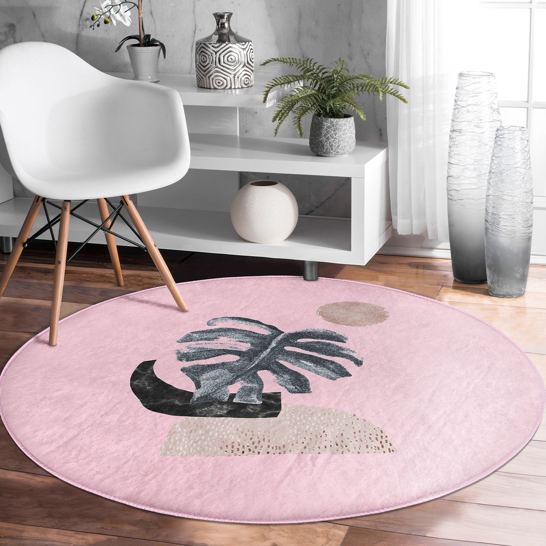 Pembe Zeminde Tropik Yaprak Desen Dijital Baskılı Özel Tasarım Salon ve Oturma Odası Yıkanabilir Kaymaz Tabanlı Yuvarlak Halı