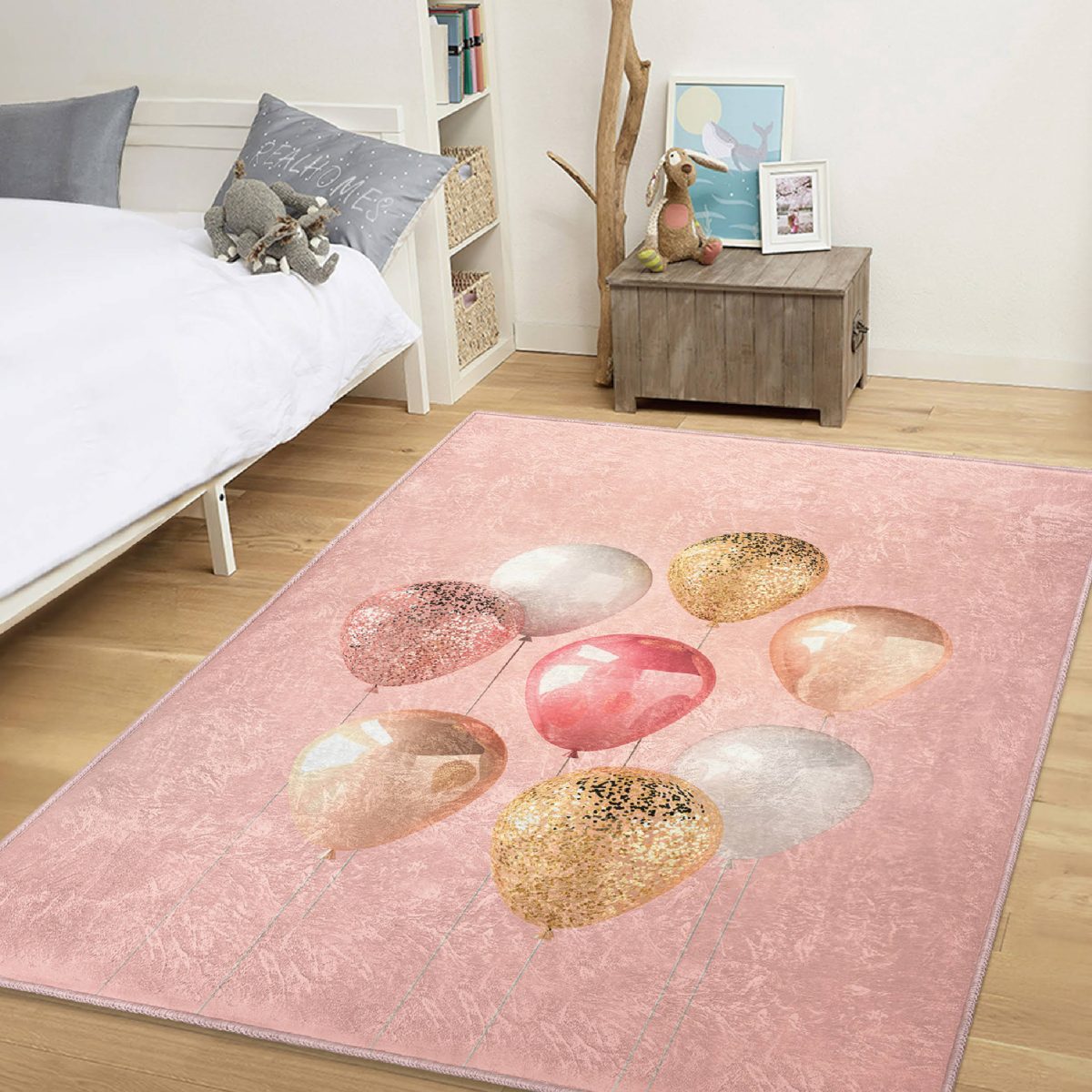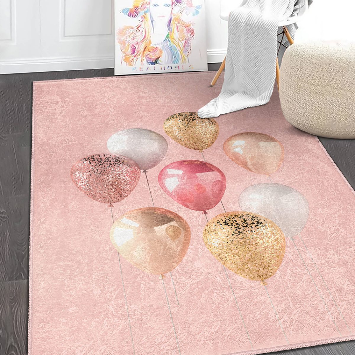 Pembe Zeminli Balonlar Desenli Çocuk & Genç Odası Makinede Yıkanabilir Kaymaz Tabanlı Özel Ölçü Dekoratif Dikdörtgen Çocuk Halısı