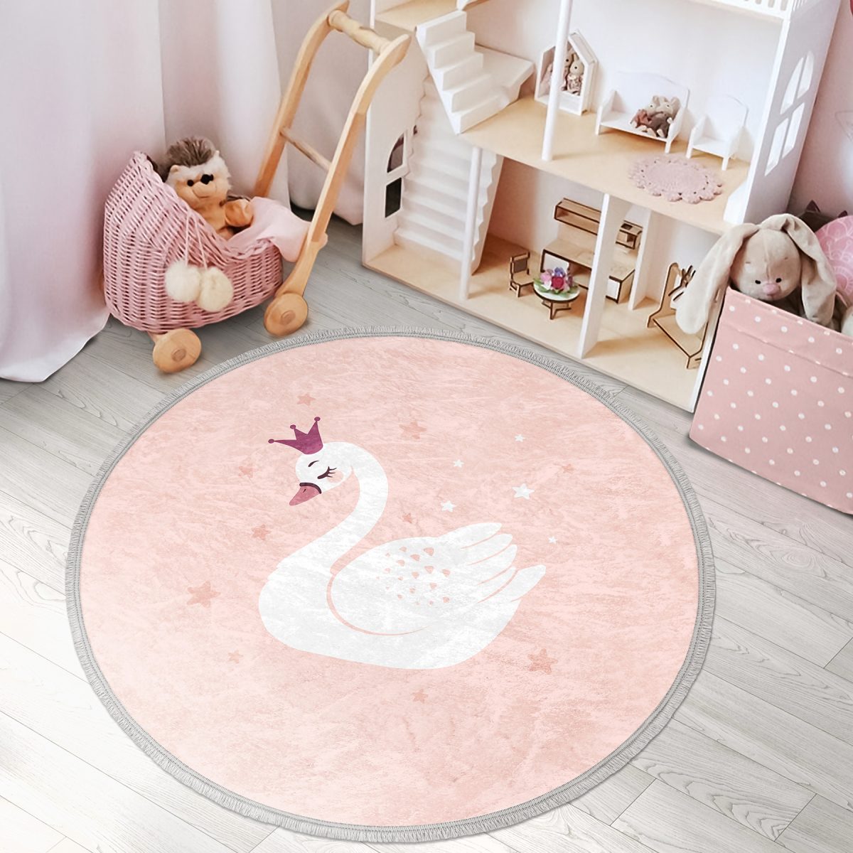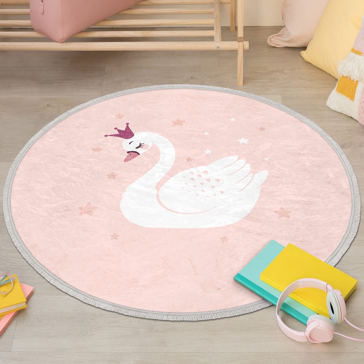Pembe Zeminli Kuğu Desenli Çocuk & Genç Odası Makinede Yıkanabilir Kaymaz Tabanlı Püsküllü Yuvarlak Çocuk Halısı