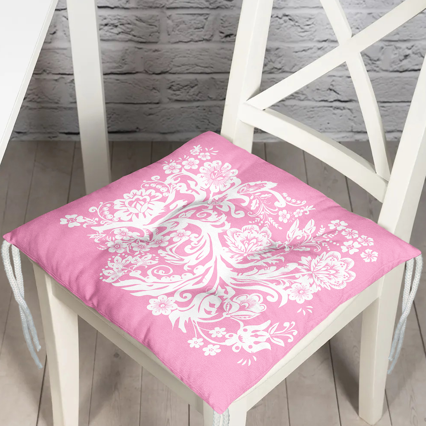 Pembe Zeminli Özel Tasarım Dijital Baskılı Modern Pofuduk Sandalye Minderi