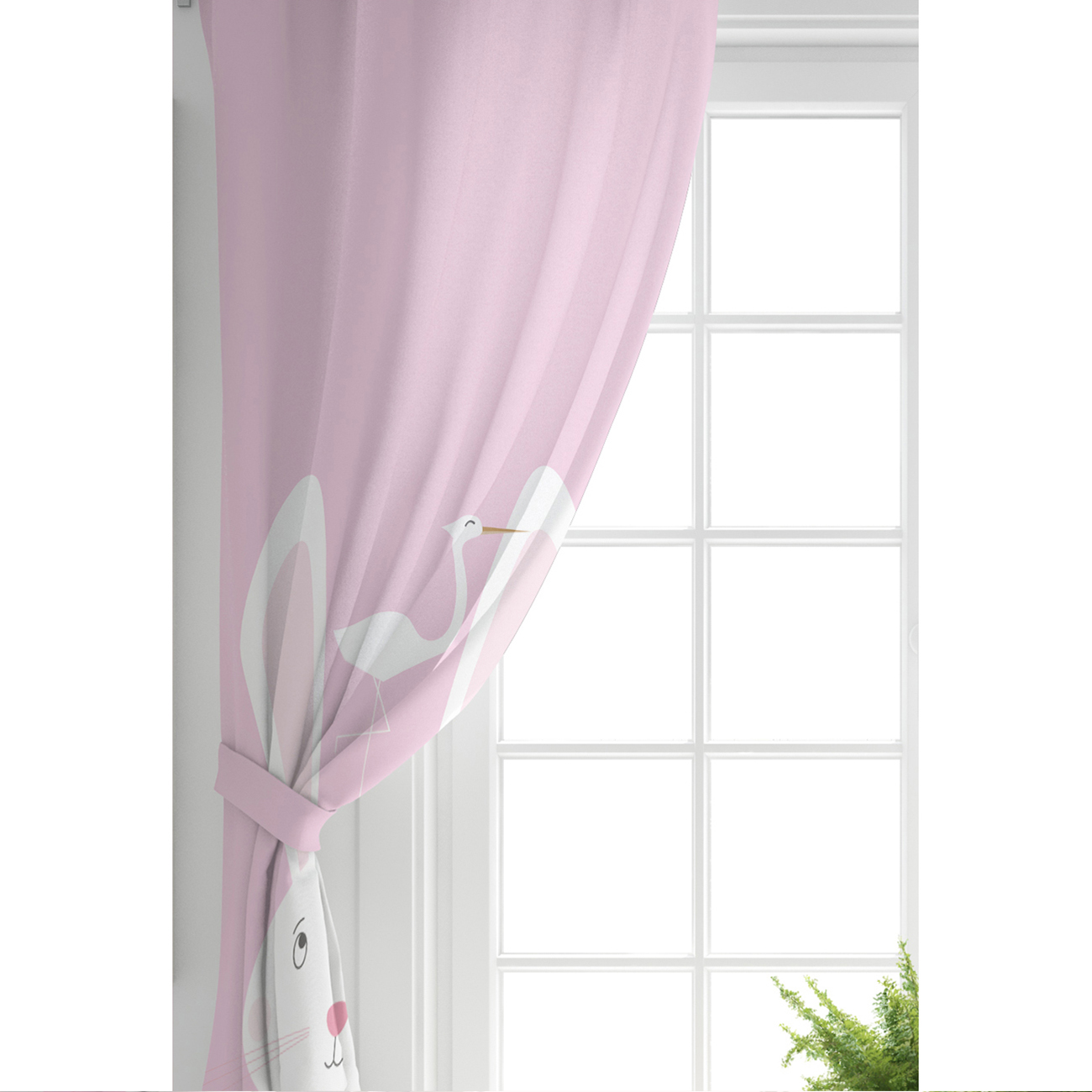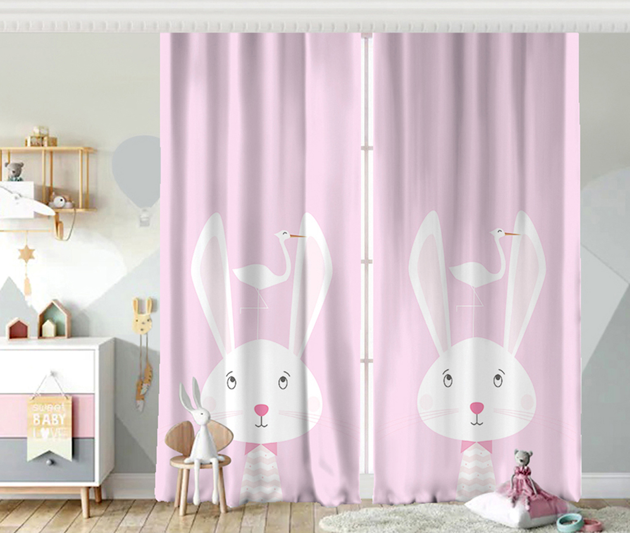 Pembe Zeminli Tavşan Desenli Bebek Odası Fon Perde