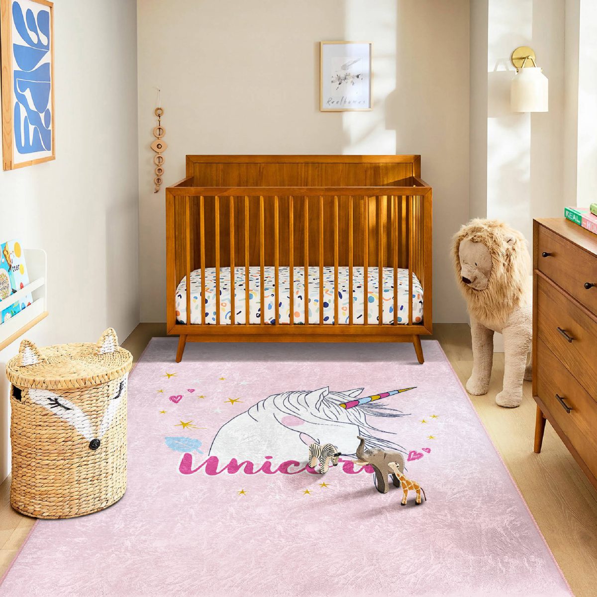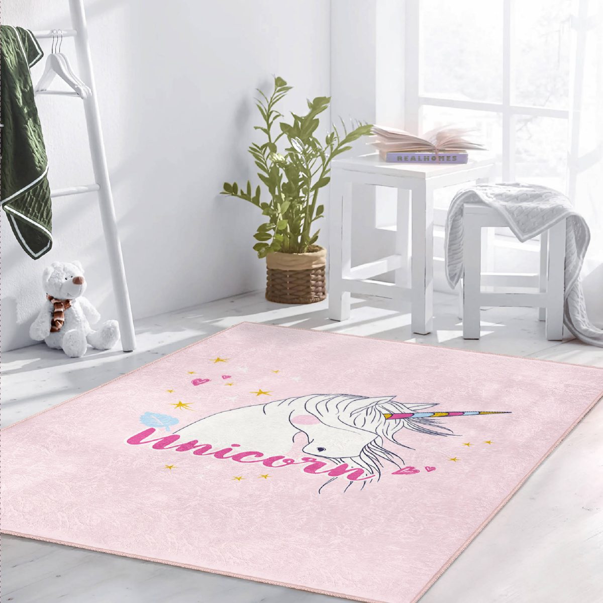 Pembe Zeminli Unicorn At Desenli Çocuk & Genç Odası Makinede Yıkanabilir Kaymaz Tabanlı Özel Ölçü Dikdörtgen Pamuk Tabanlı Çocuk Halısı
