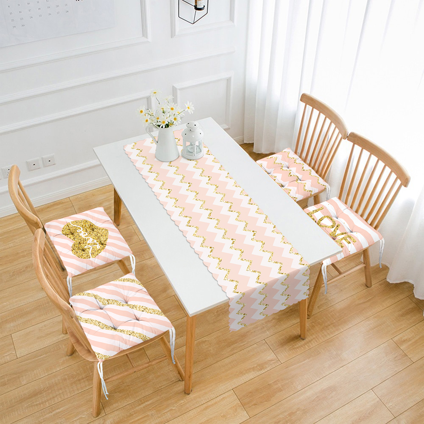Pembe Zigzag Gold Detaylı Özel Tasarım 4 Pofuduk Sandalye Minderi ve 1 Runner Seti