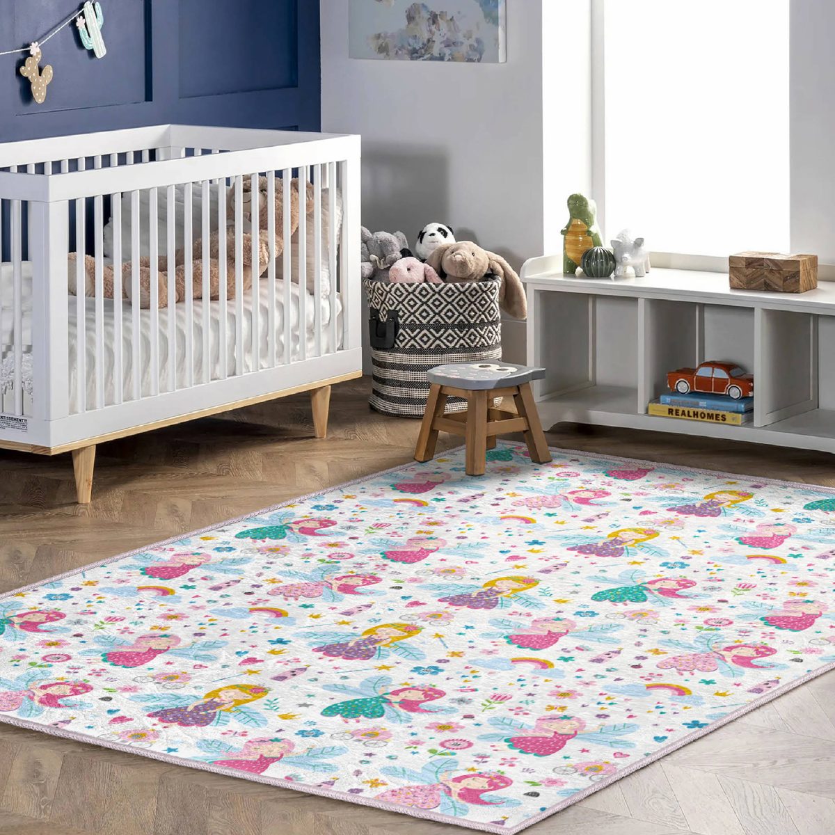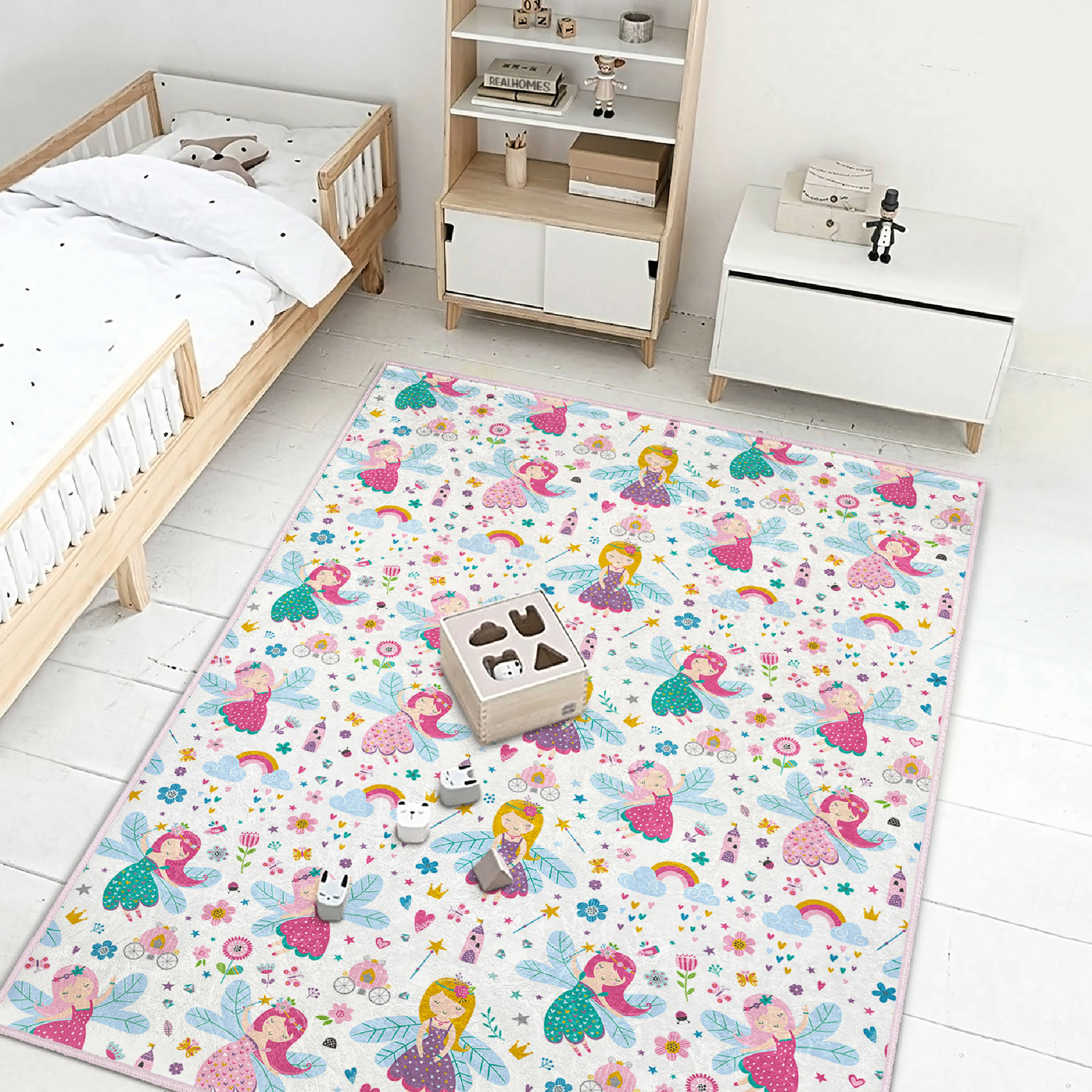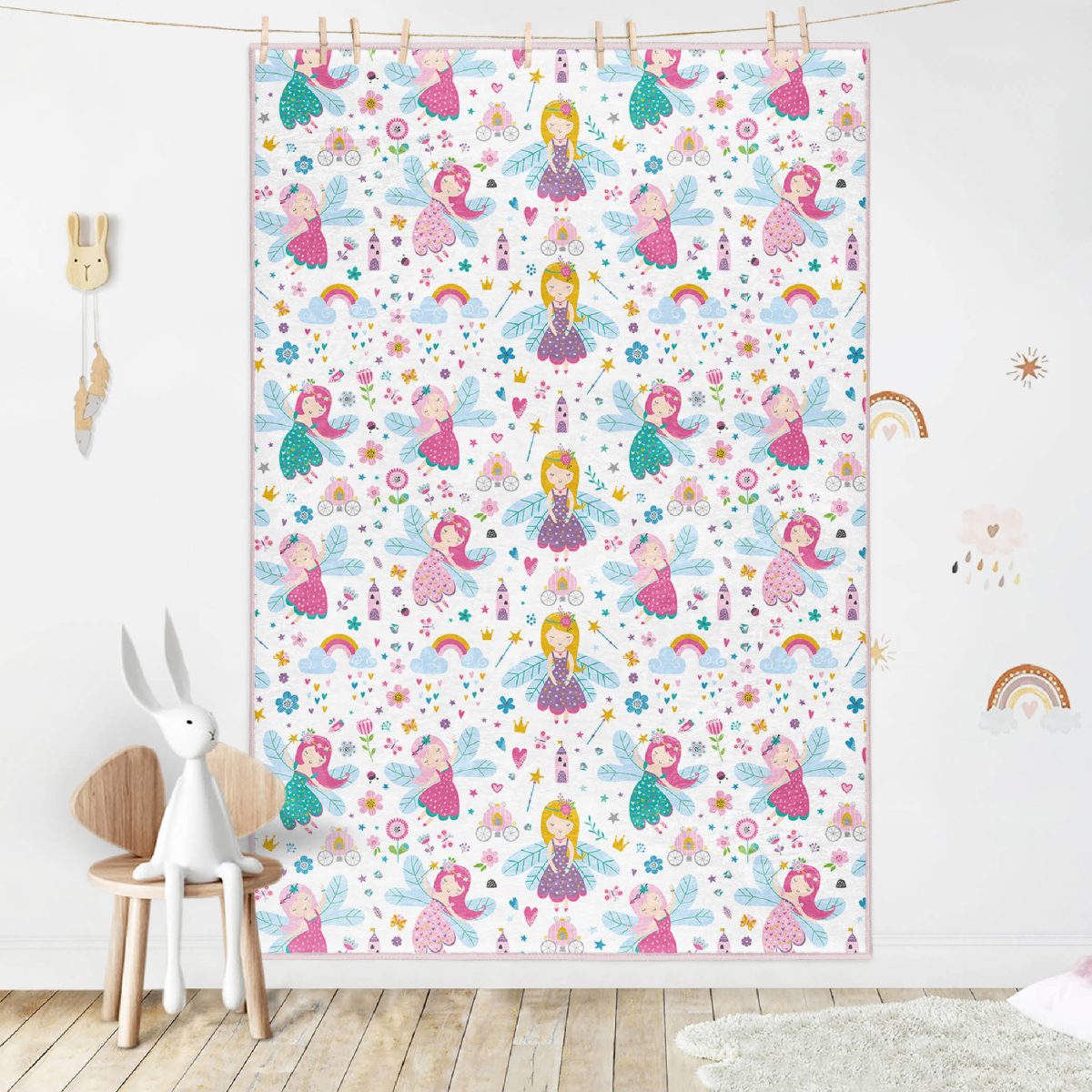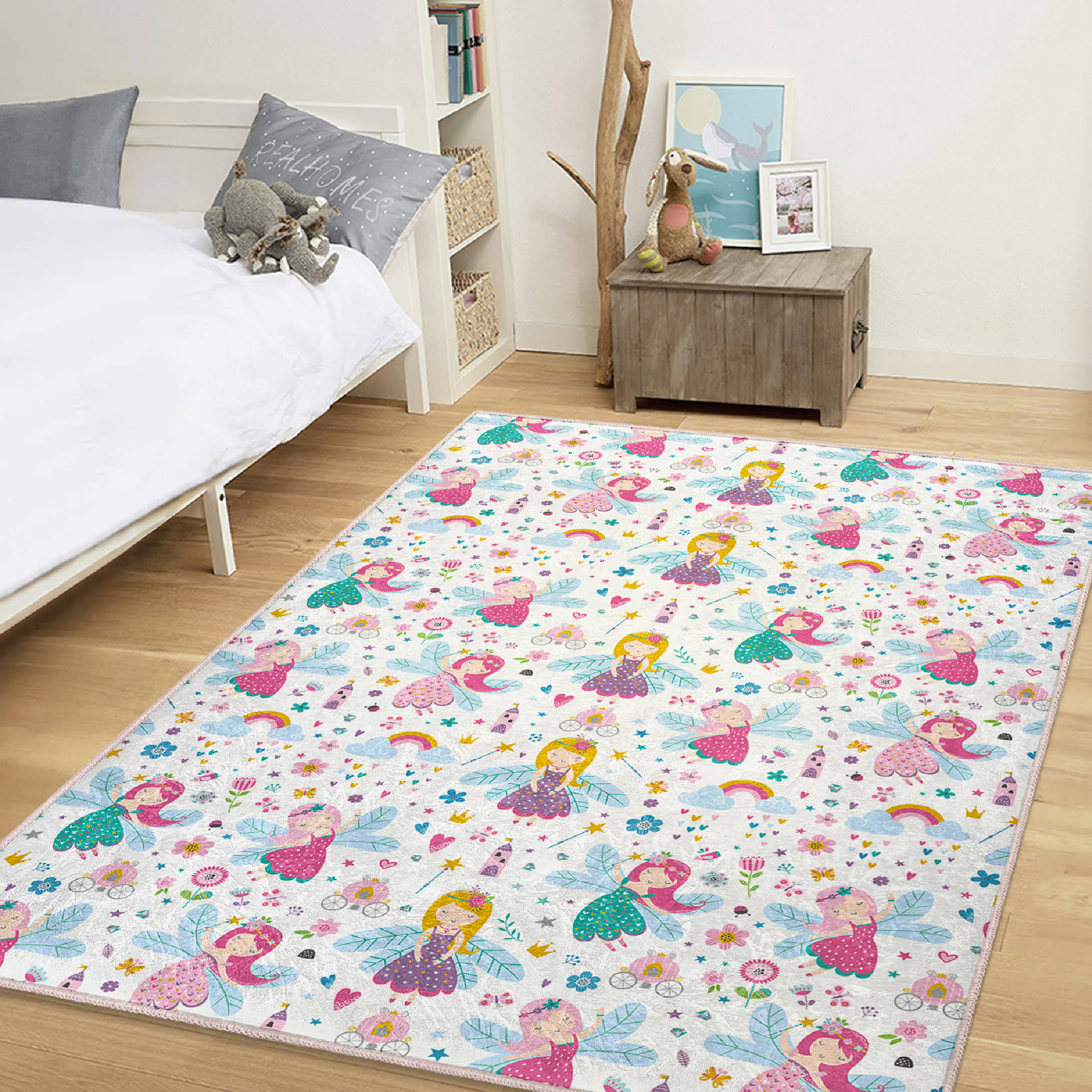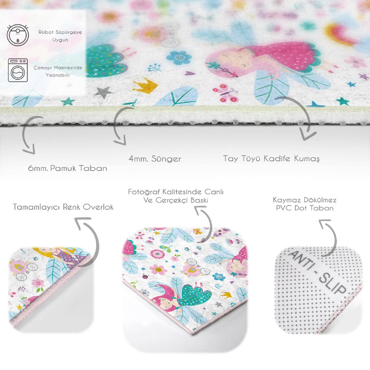 Peri Kızı Motifli Çocuk & Genç Odası Makinede Yıkanabilir Kaymaz Tabanlı Özel Ölçü Dikdörtgen Pamuk Tabanlı Çocuk Odası Halısı