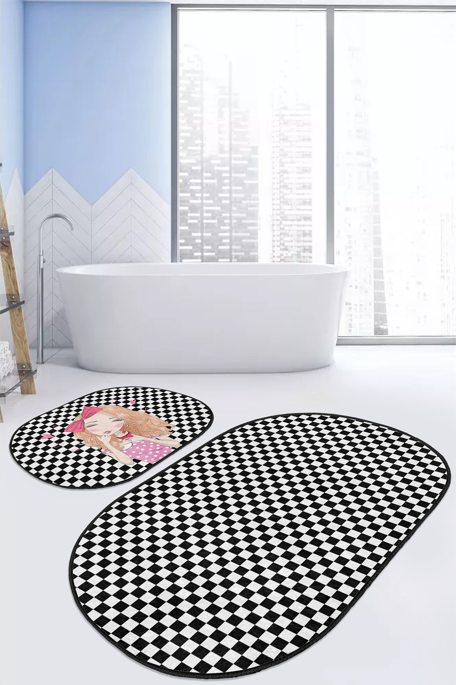 Popcake Kız Motifli Dama Temalı 2’li Oval Kaymaz Tabanlı Banyo & Mutfak Paspas Takımı