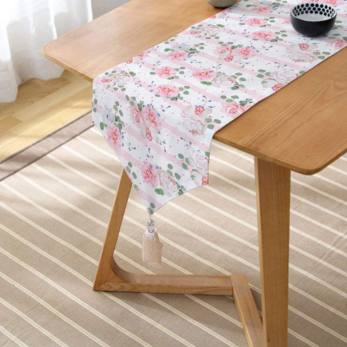 Pudra Beyaz Yatay Temalı Dijital Baskılı Püsküllü Şönil Üçgen Runner Realhomes