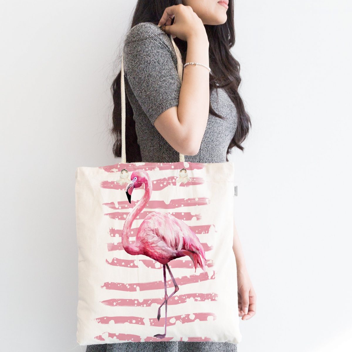 Pudra Çizgi Desenli Flamingo BAskılı Fermuarlı Modern Kumaş Çanta
