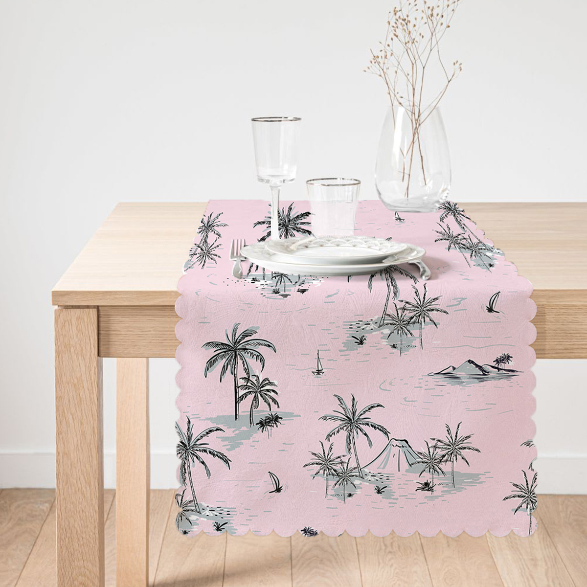 Pudra Renk Temalı Palmiye Adası Dijital Baskılı Runner