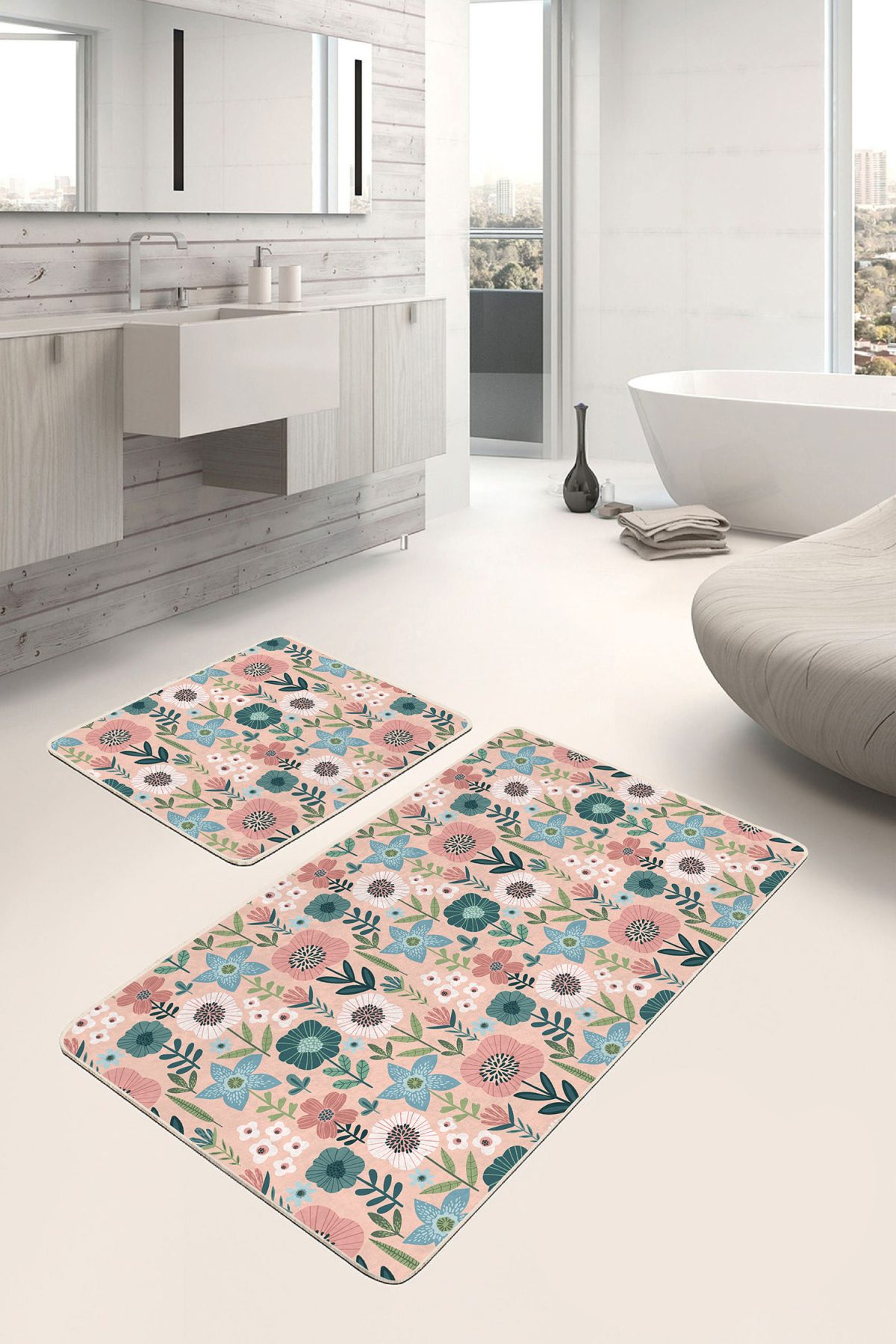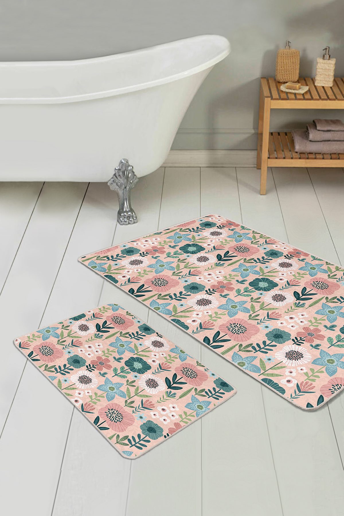 Pudra Zemin Tropik Çiçekler Dijital Baskılı 2’li Kaymaz Tabanlı Banyo & Mutfak Paspas Takımı