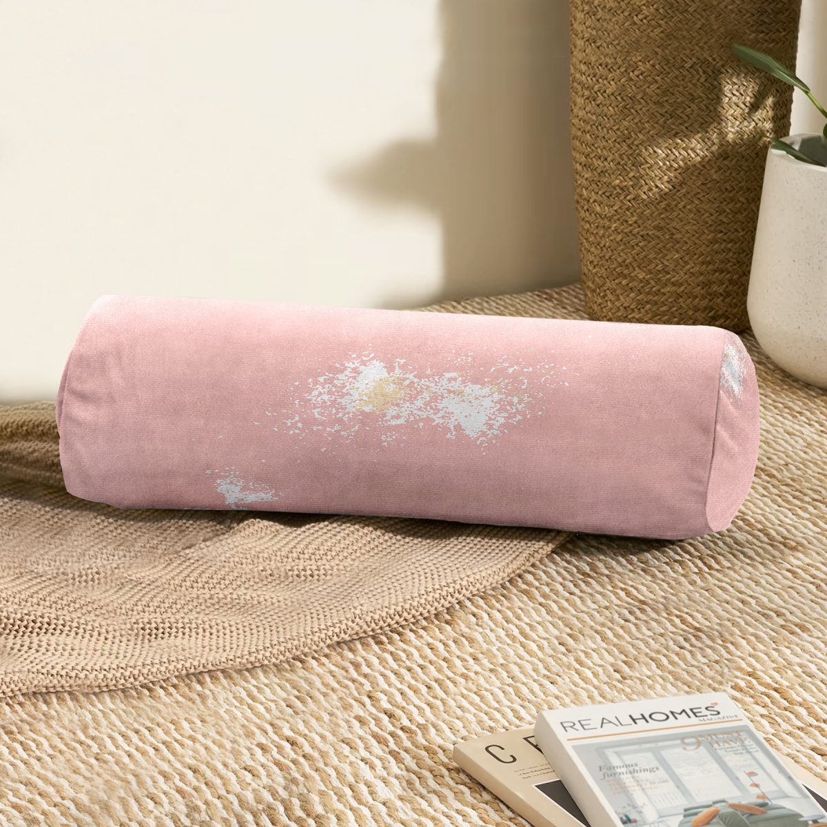 Pudra Zeminde Gold Ve Beyaz Detaylı Dijital Baskılı Modern İç Dolgulu – Fermuarlı Süet Silindir Yuvarlak Yastık Kırlent
