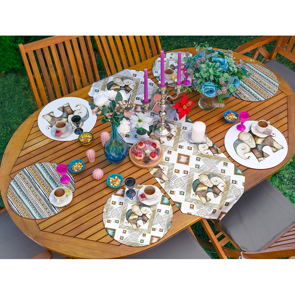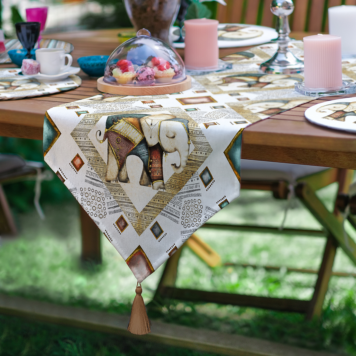 Realhomes 6+1 Etnik İskandinav Motifli Fil Tasarımlı Modern Püsküllü Runner ve Yuvarlak Servis Altlığı & Supla Seti Realhomes