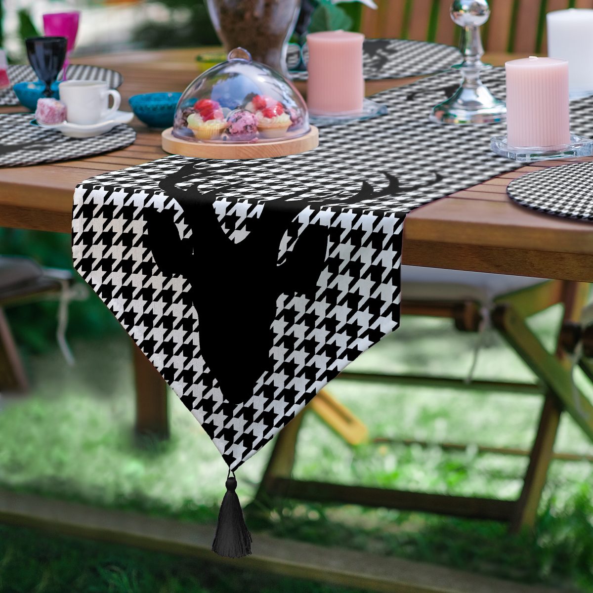 Realhomes 6+1 Kazayağı Temalı Geyik Tasarımlı Dijital Baskılı Dekoratif Püsküllü Runner ve Yuvarlak Servis Altlığı & Supla Seti