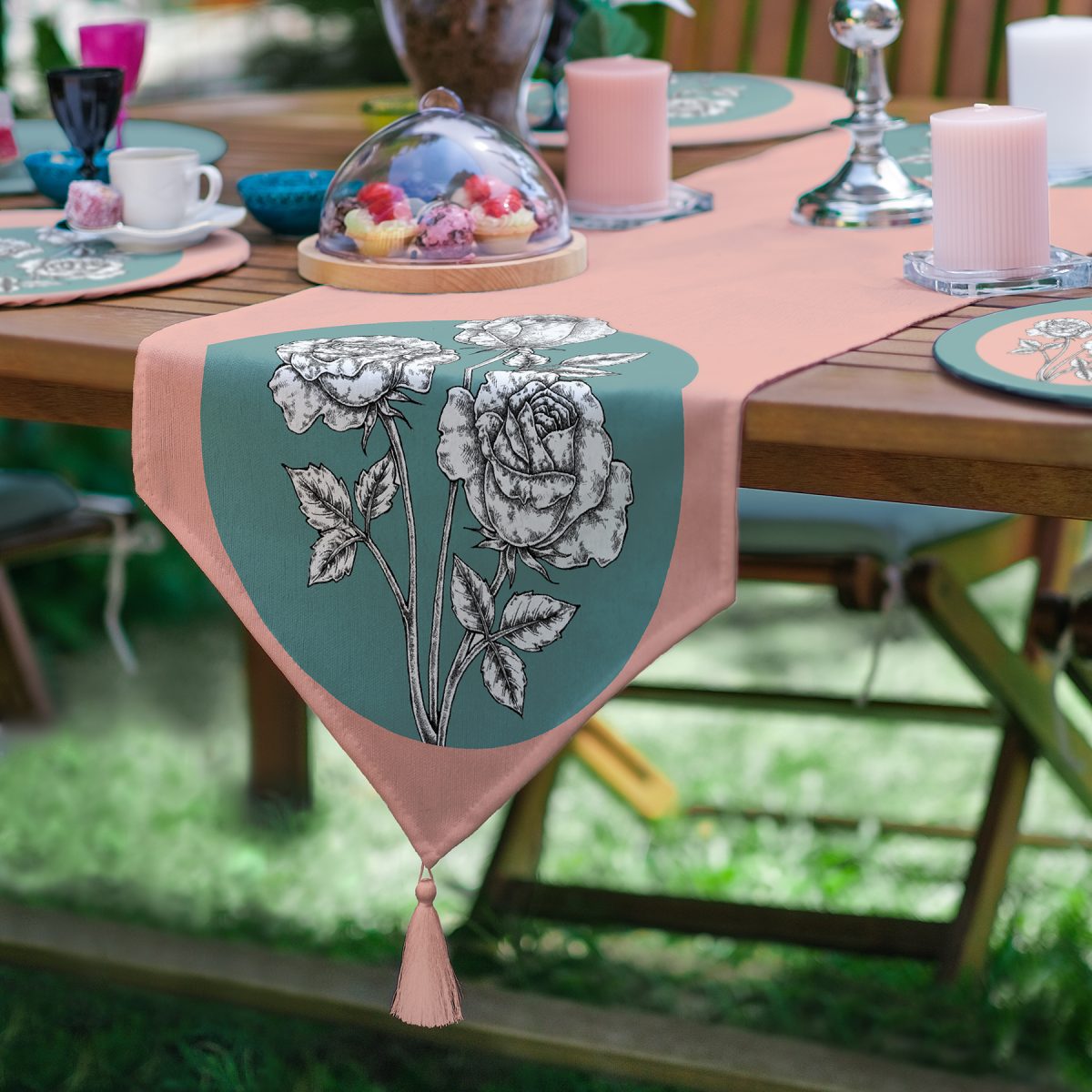 Realhomes 6+1 Pudra Yeşil Renkli Çiçek Detaylı Özel Tasarım Püsküllü Runner ve Yuvarlak Servis Altlığı & Supla Seti Realhomes