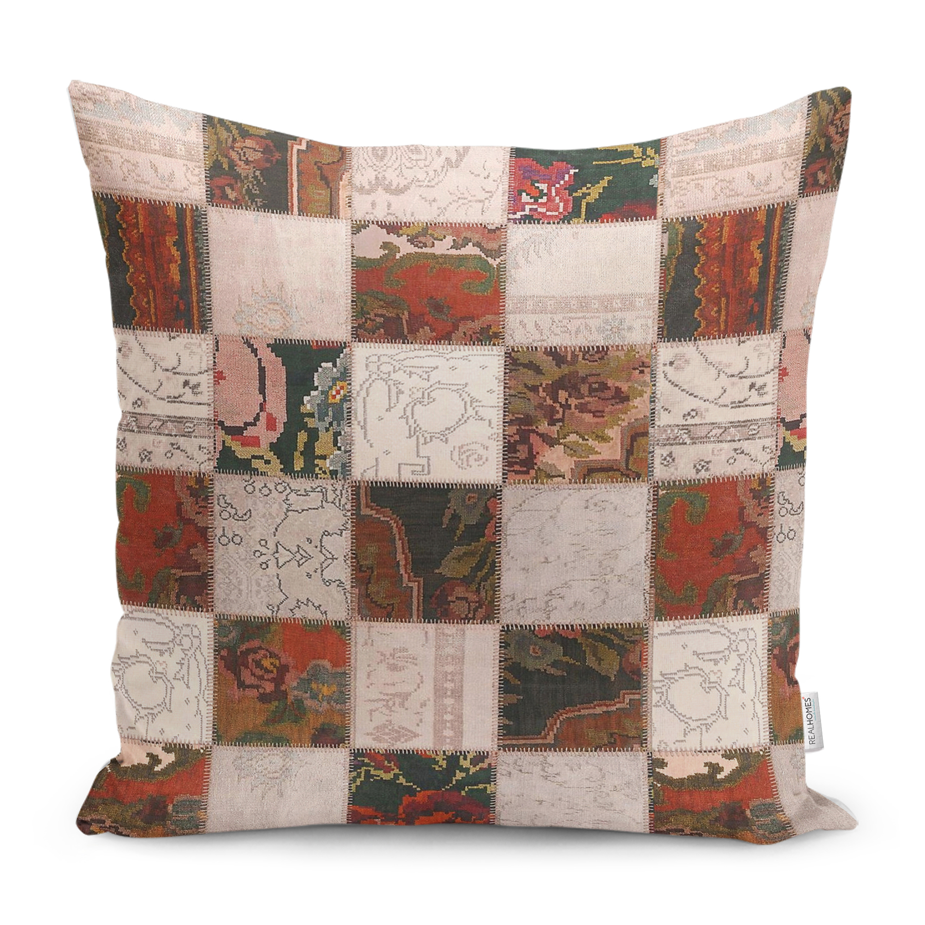 RealHomes Bej Zeminde Patchwork Motifli Çiçek Desenli Dijital Baskılı Yastık Kırlent Kılıfı Realhomes