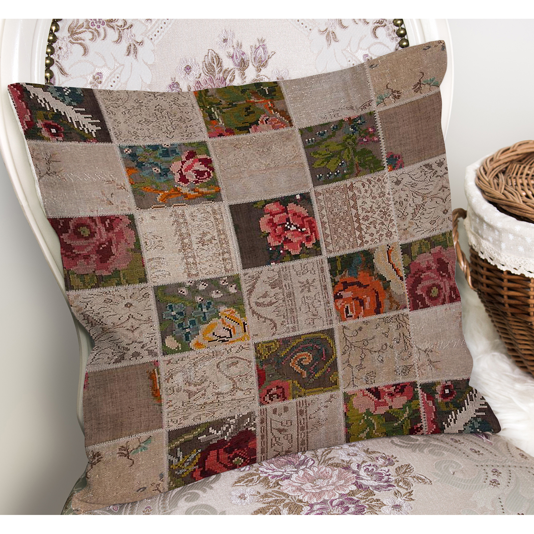 RealHomes Bej Zeminde Patchwork Motifli Çiçek Desenli Dijital Baskılı Yastık Kırlent Kılıfı