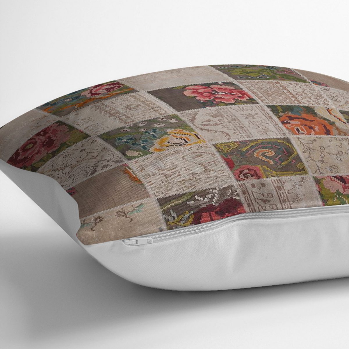 RealHomes Bej Zeminde Patchwork Motifli Çiçek Desenli Dijital Baskılı Yastık Kırlent Kılıfı Realhomes