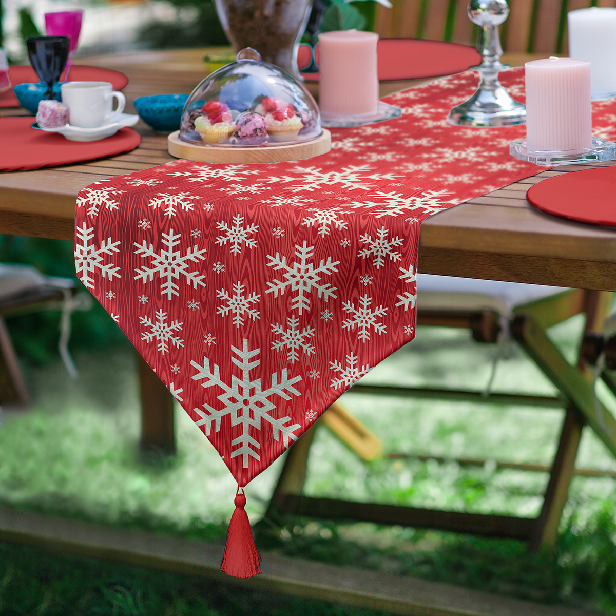 Realhomes Beyaz Kar Taneleri Motifli Dijital Baskılı Dekoratif Özel Tasarım Püsküllü Şönil Üçgen Runner Realhomes