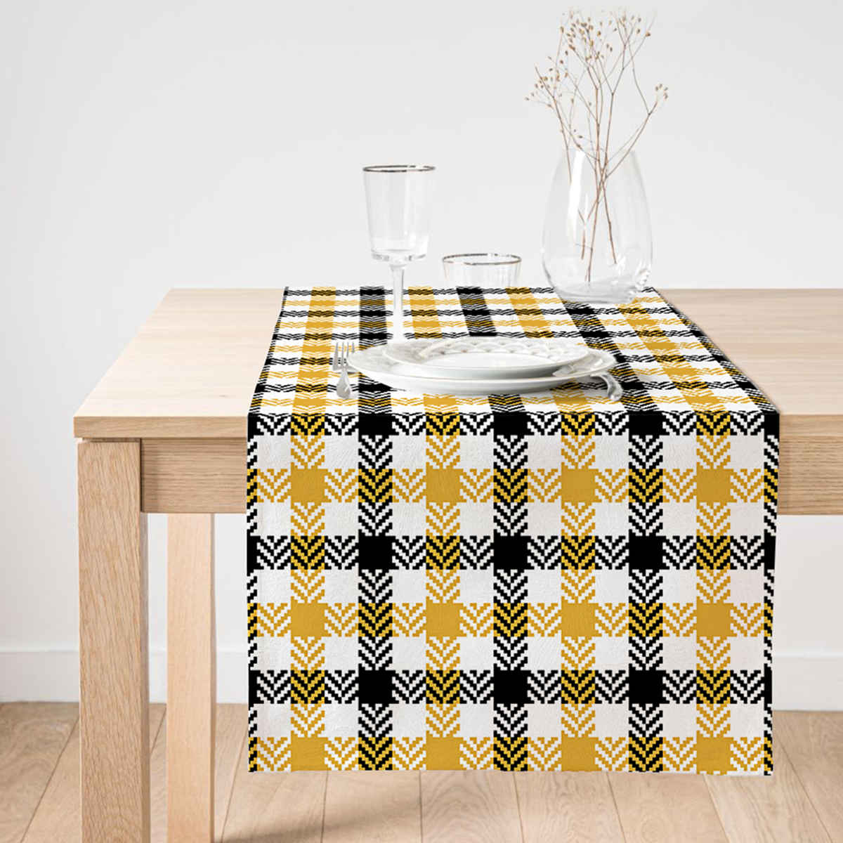 Realhomes Beyaz Zemin Üzerinde Siyah Sarı Ekose Desenli Dijital Baskılı Özel Tasarım Süet Runner Realhomes