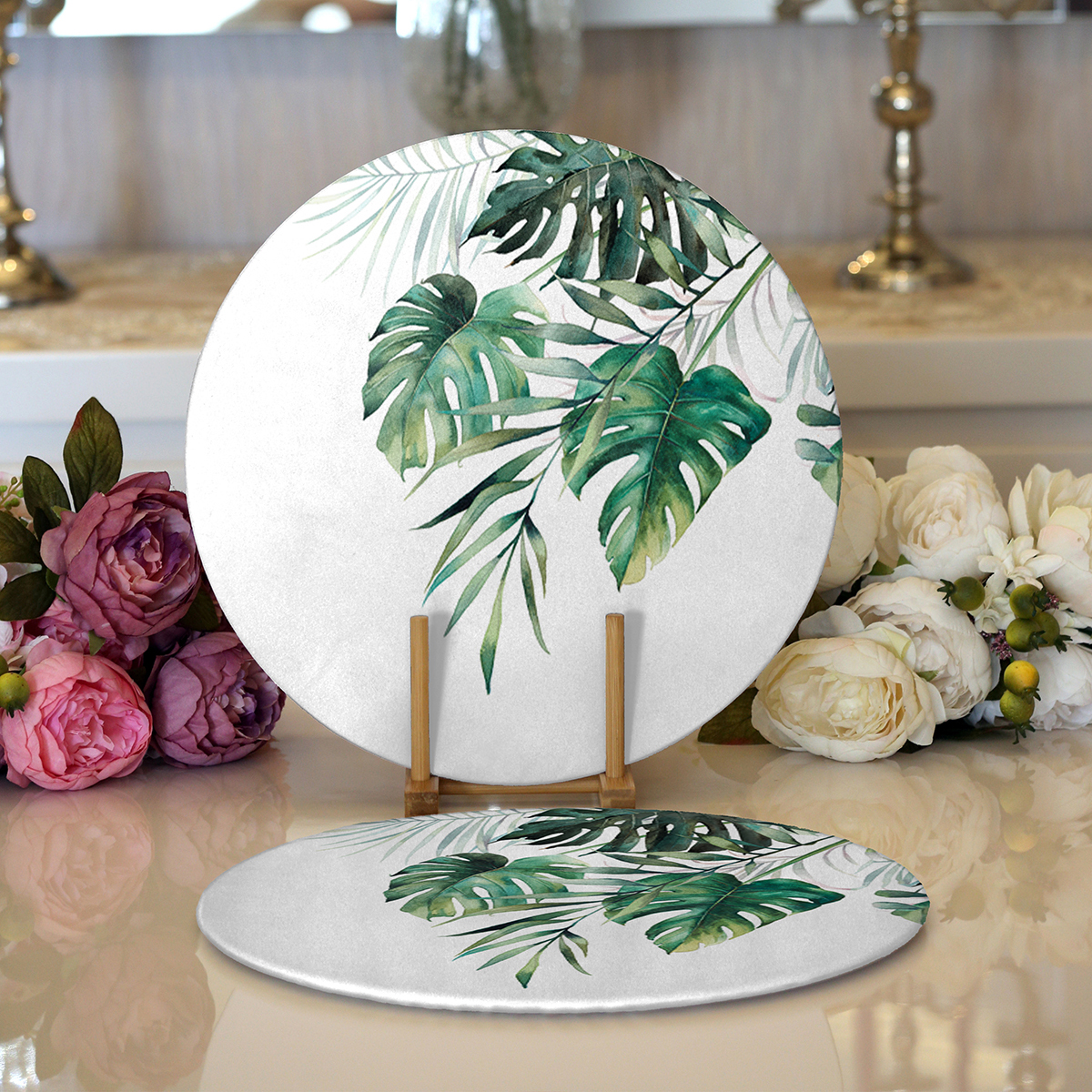 Realhomes Beyaz Zemin Üzerinde Yaprak Desenli Dijital Baskılı Modern 2’li Yuvarlak Servis Altlığı – Supla
