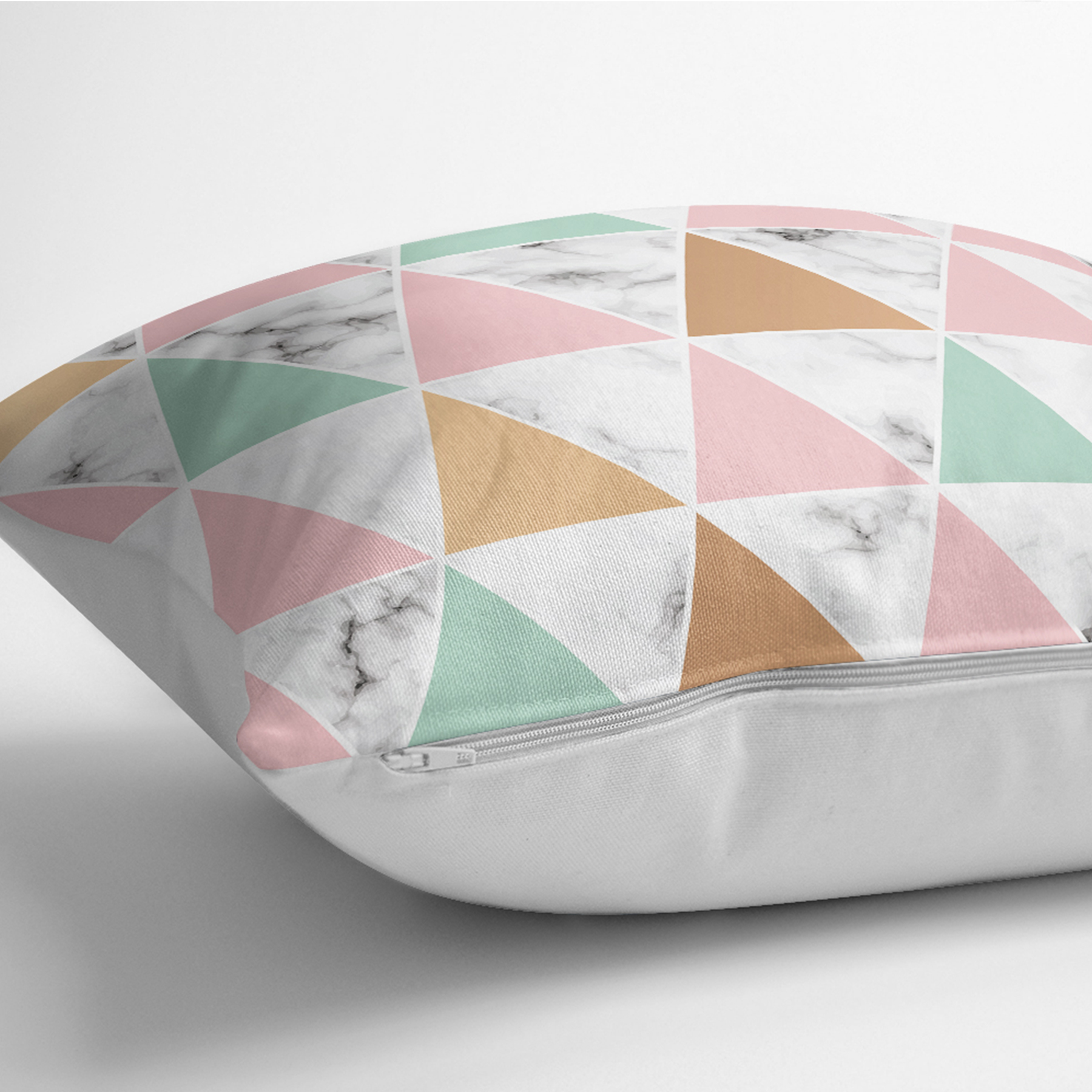 RealHomes Beyaz Zeminde Üçgen Motifli Mermer Desenli Dijital Baskılı Yastık Kırlent Kılıfı Realhomes