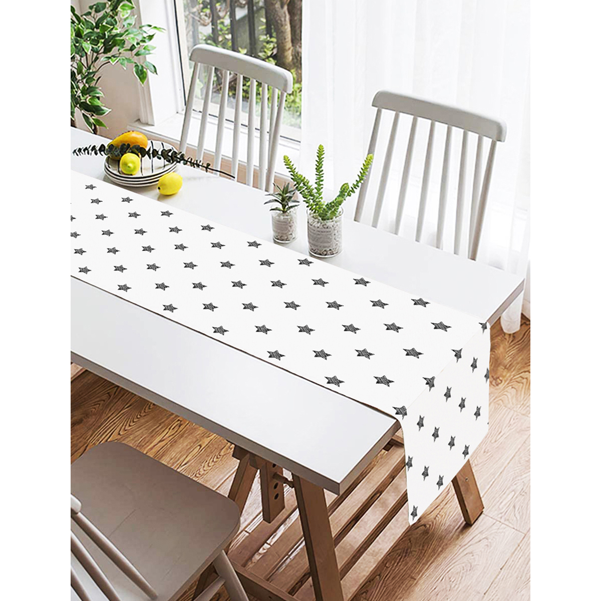 Realhomes Beyaz Zeminli Yıldız Desenli Dijital Baskılı Dekoratif Süet Runner