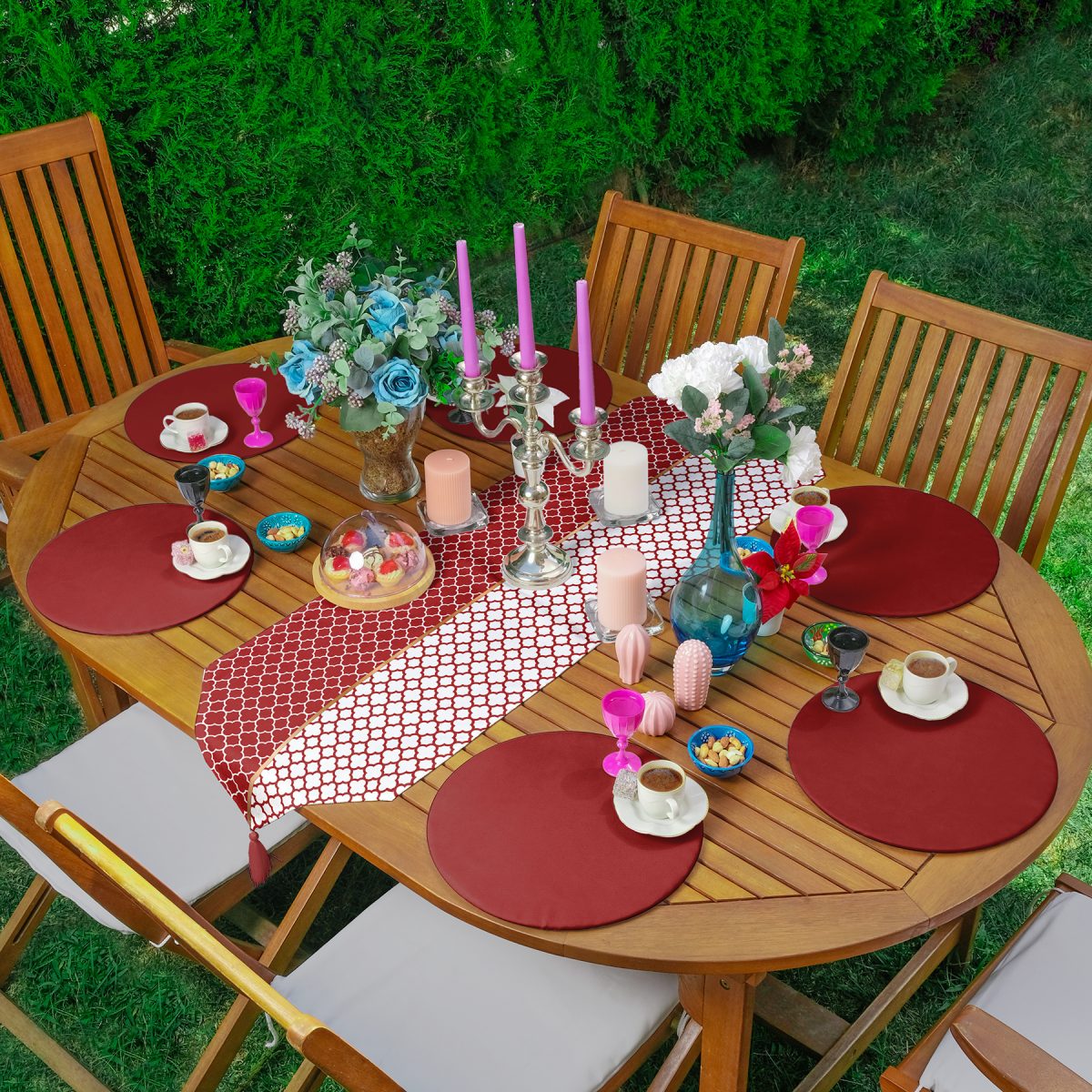 Realhomes Bordo & Beyaz Ogea Desenli Püsküllü Runner & 6’lı Bordo Düz Renk Supla – Servis Altlığı