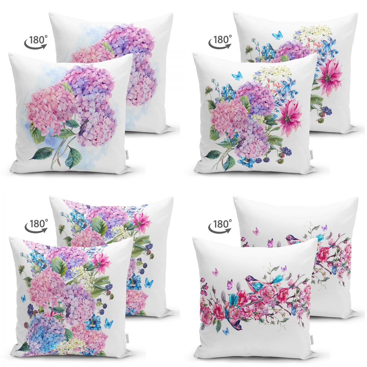 Realhomes Çift Taraflı Ortanca Çiçeği Motifli Modern 4’lü Kombin Süet Yastık Kırlent Kılıf Seti