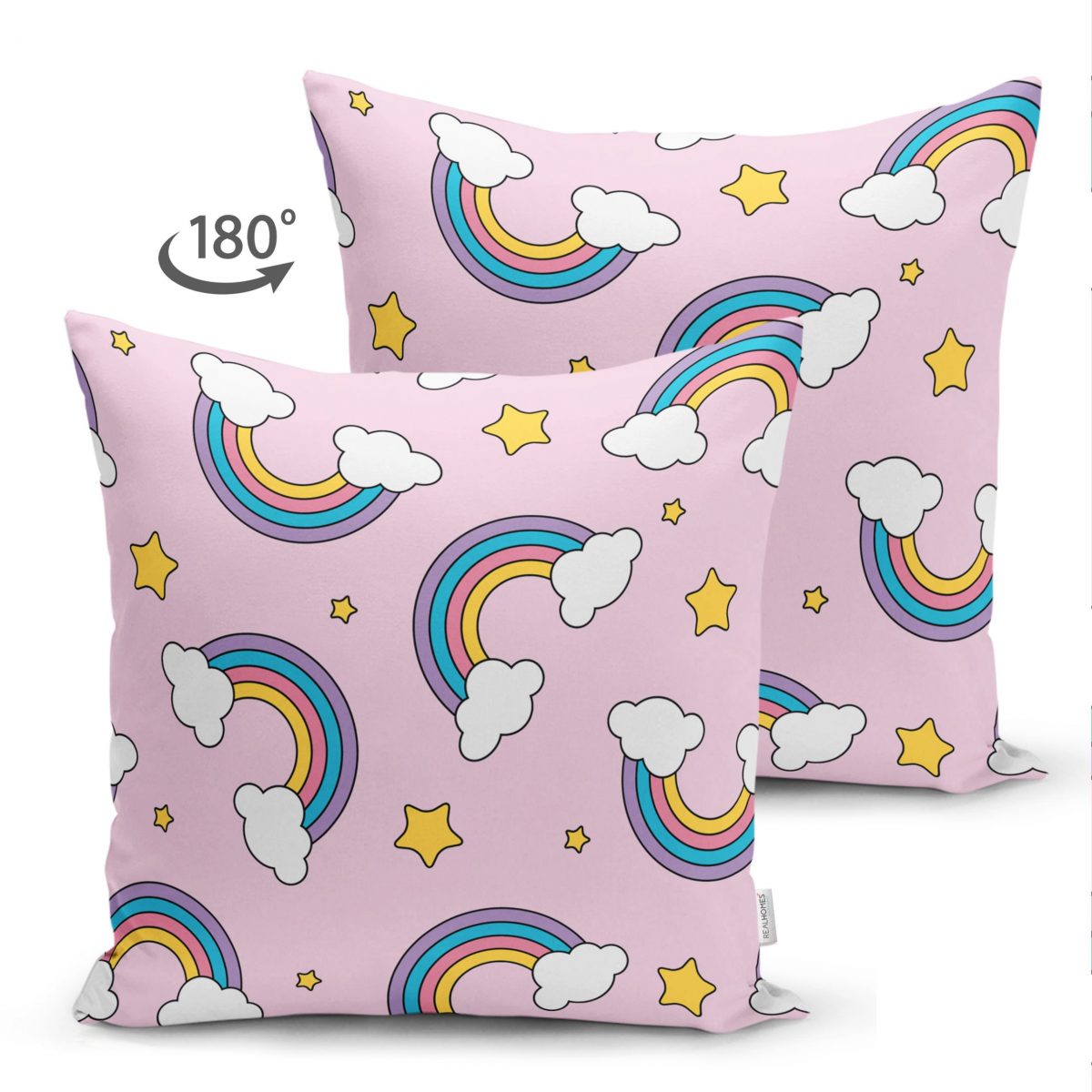 Realhomes Çift Taraflı Pembe Zeminde Unicorn Gökkuşağı Dijital Baskılı Modern Süet Kırlent Kılıfı Realhomes
