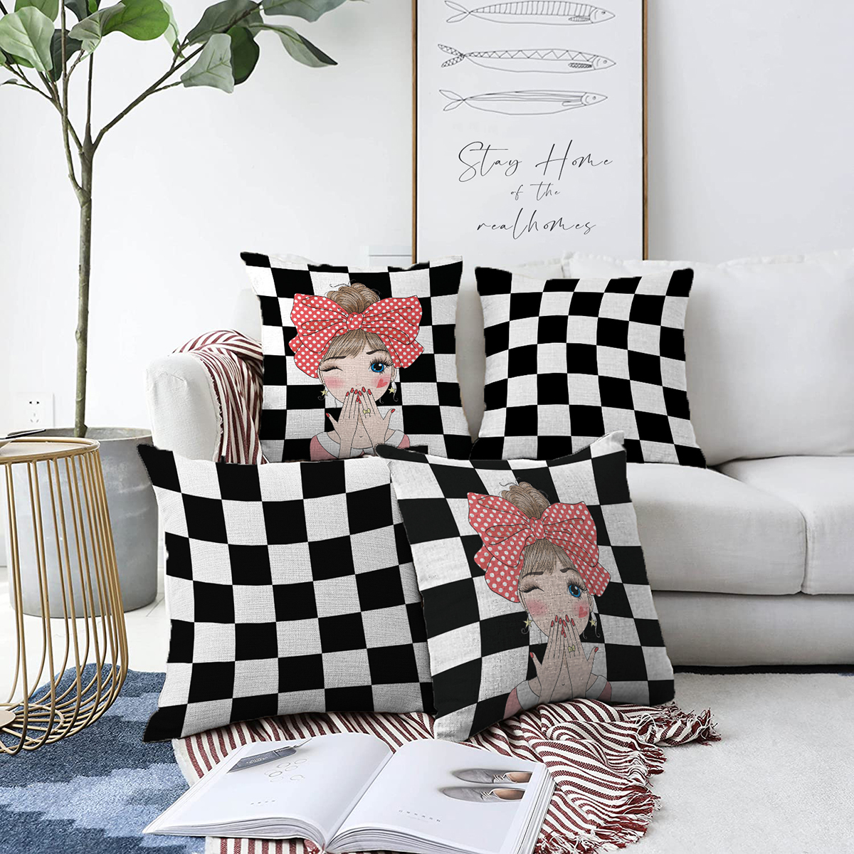Realhomes Çift Taraflı Siyah Beyaz Damalı Kız Motifli 4’lü Modern Şönil Kırlent Kılıf Seti