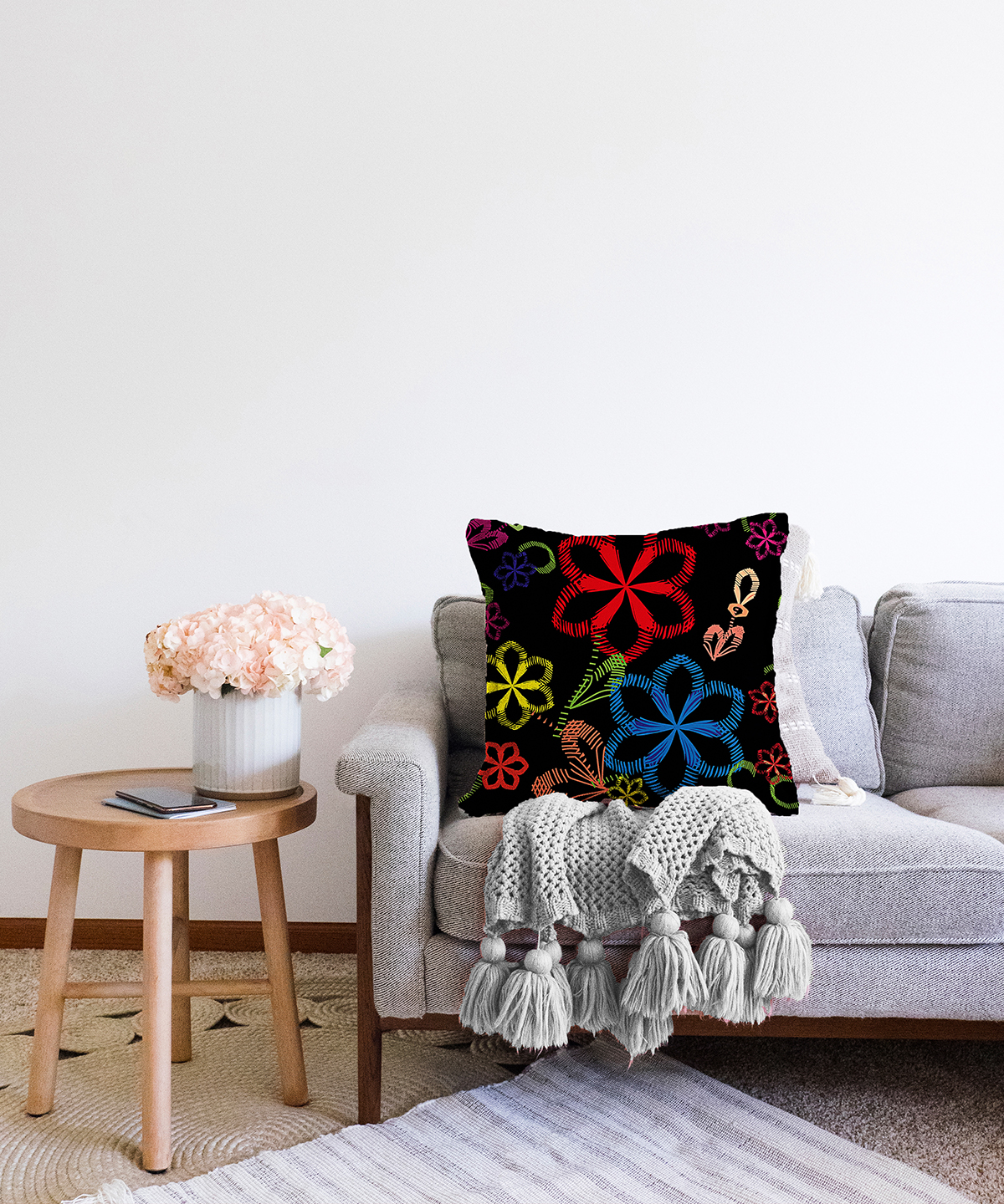 Realhomes Siyah Zeminli Rengarenk Çiçekler Dijital Baskılı Modern Raşel Kadife Yastık Kılıfı
