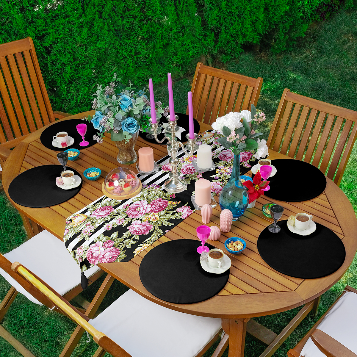 Realhomes Çizgili Zemin Renkli Gül Motifli Üçgen Püsküllü Runner 1 Adet & 6 Adet Siyah Renkli Supla Realhomes