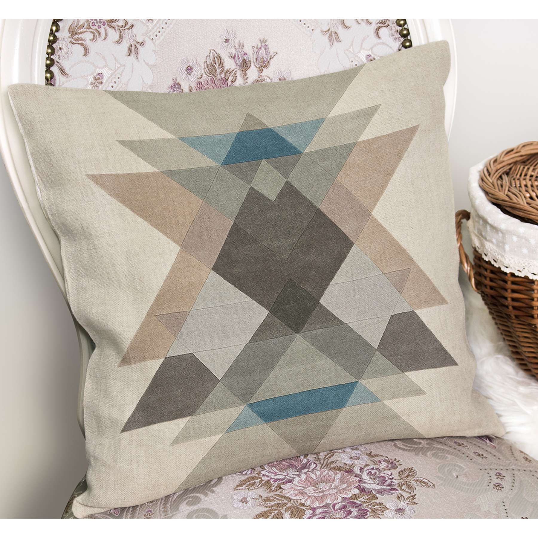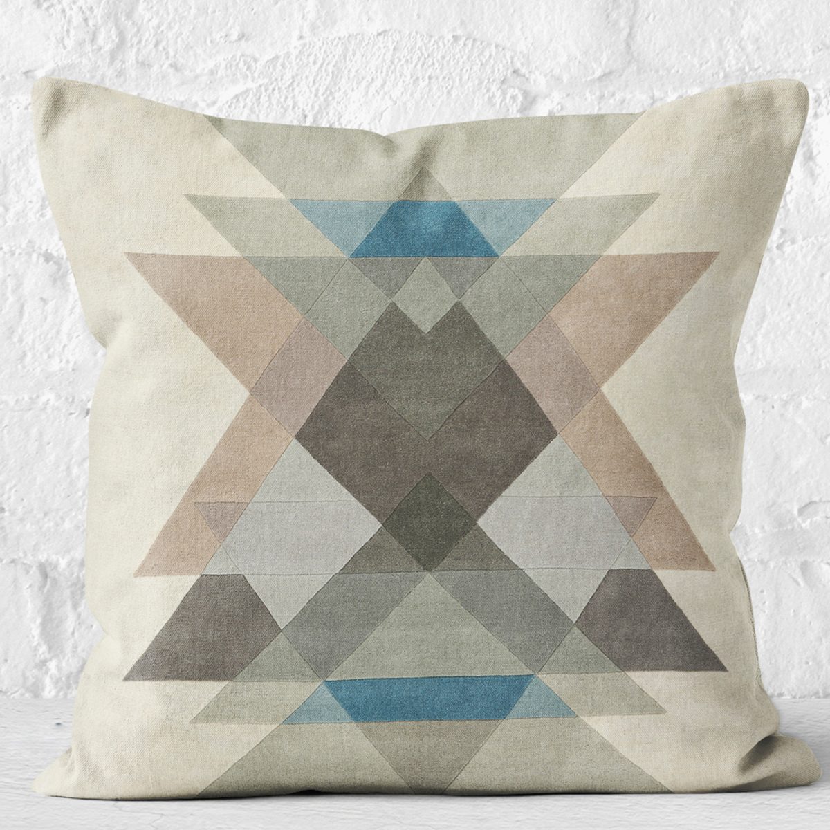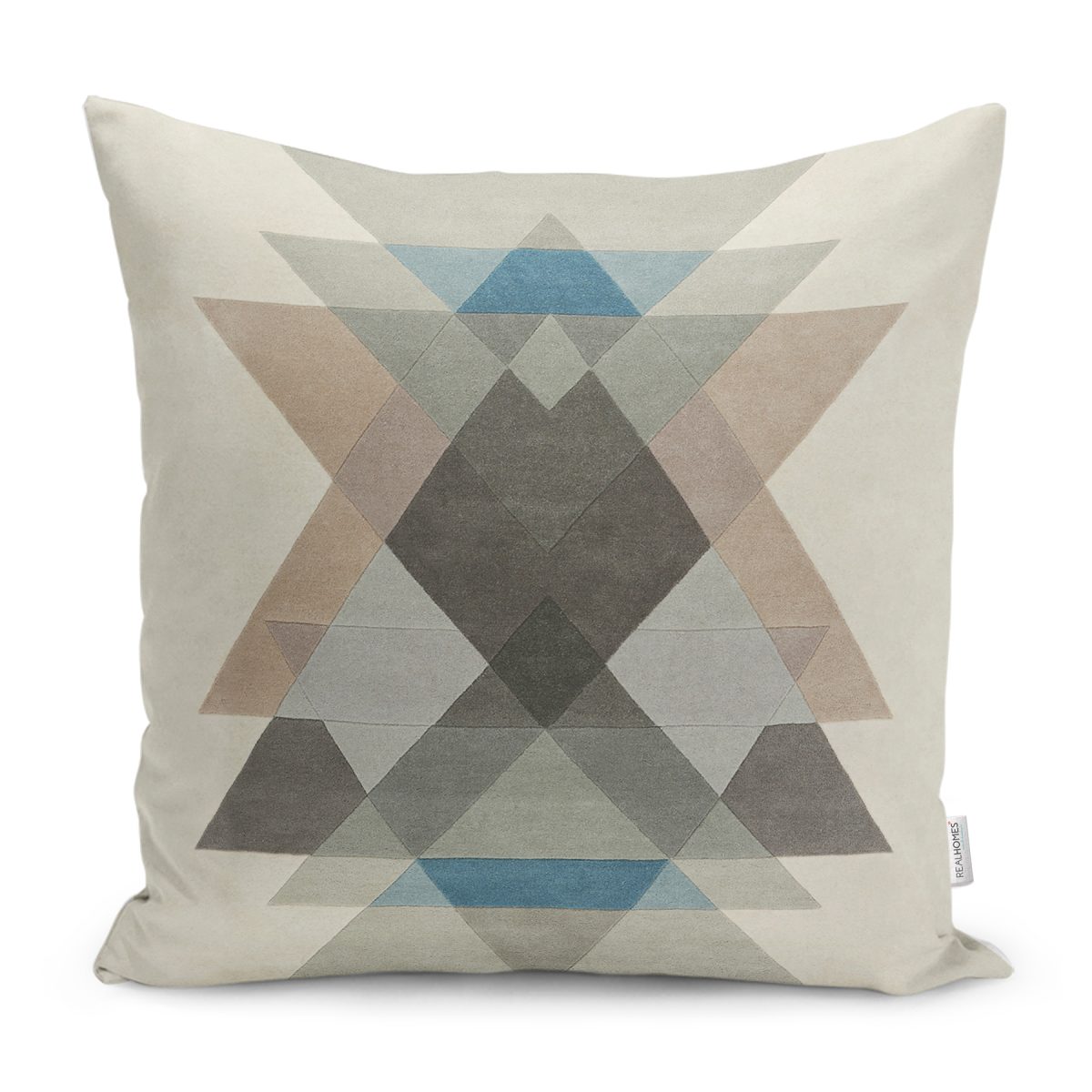 RealHomes Ekru - Kahverengi Zeminde Geometrik Motifli Üçgen Desenli Dijital Baskılı Yastık Kırlent Kılıfı