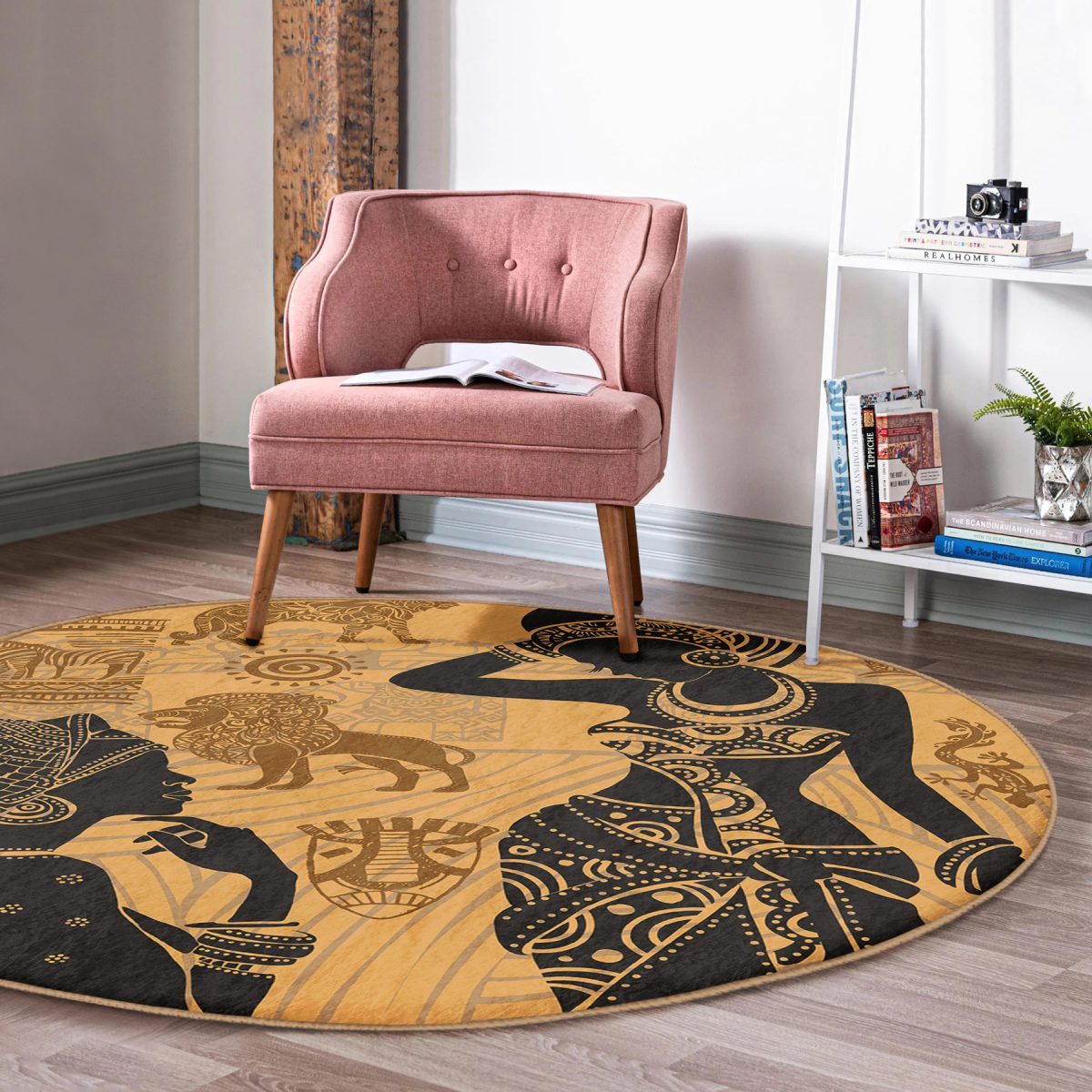 Realhomes Etnik Afrika Desenli Modern Kahverengi Outdoor Yıkanabilir Kaymaz Tabanlı Yuvarlak Kadife Halı