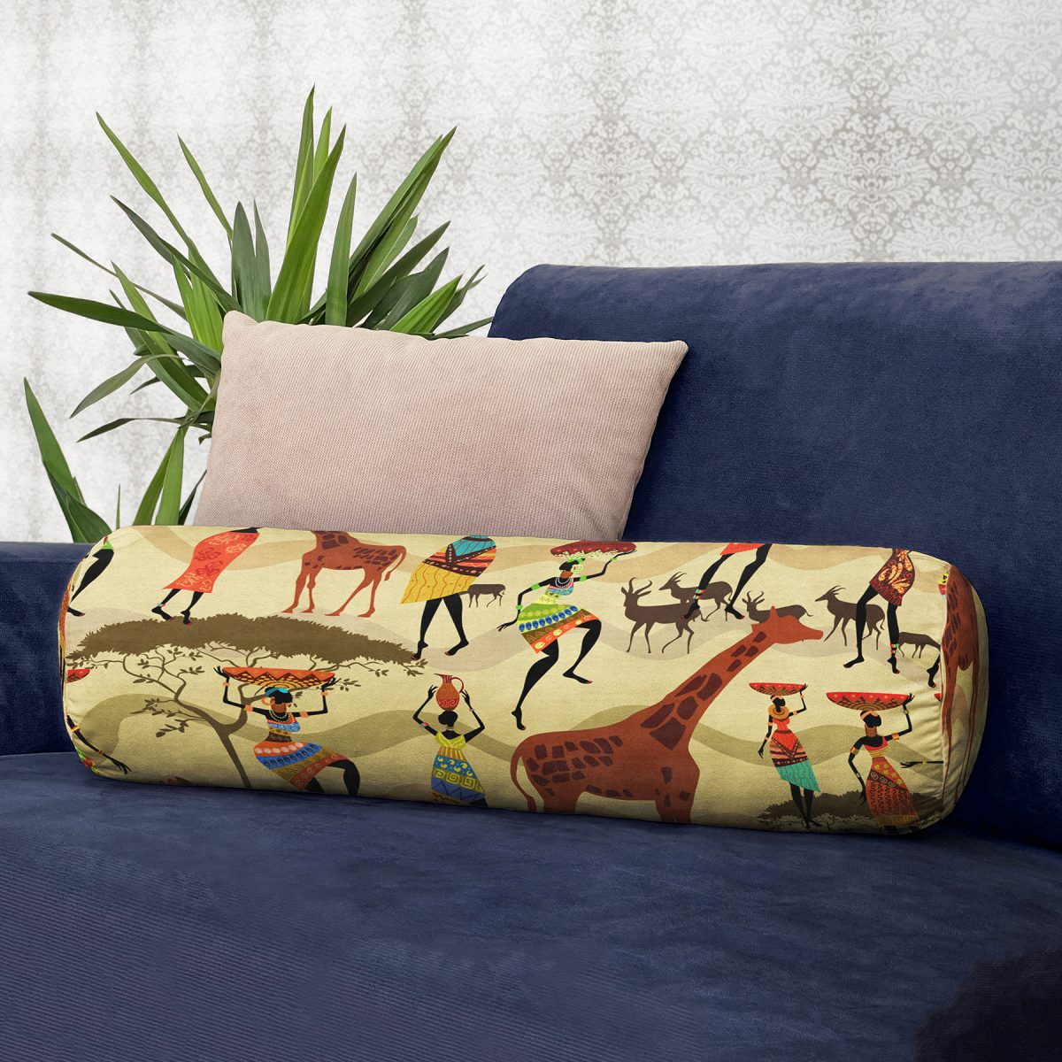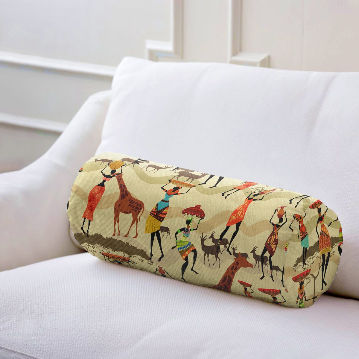 Realhomes Etnik Afrikan Desenli Özel Tasarım İç Dolgulu – Fermuarlı Süet Silindir Yuvarlak Yastık Kırlent