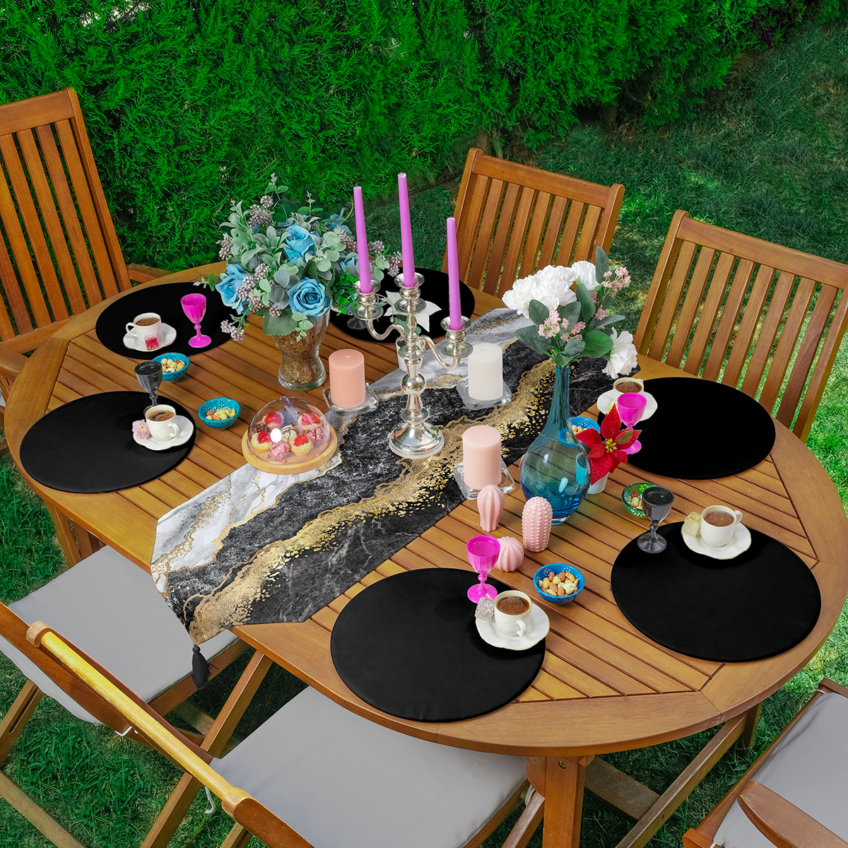 Realhomes Gold Detaylı Mavi Mermer Desenli Üçgen Püsküllü Runner 1 Adet & 6 Adet Siyah Renkli Supla