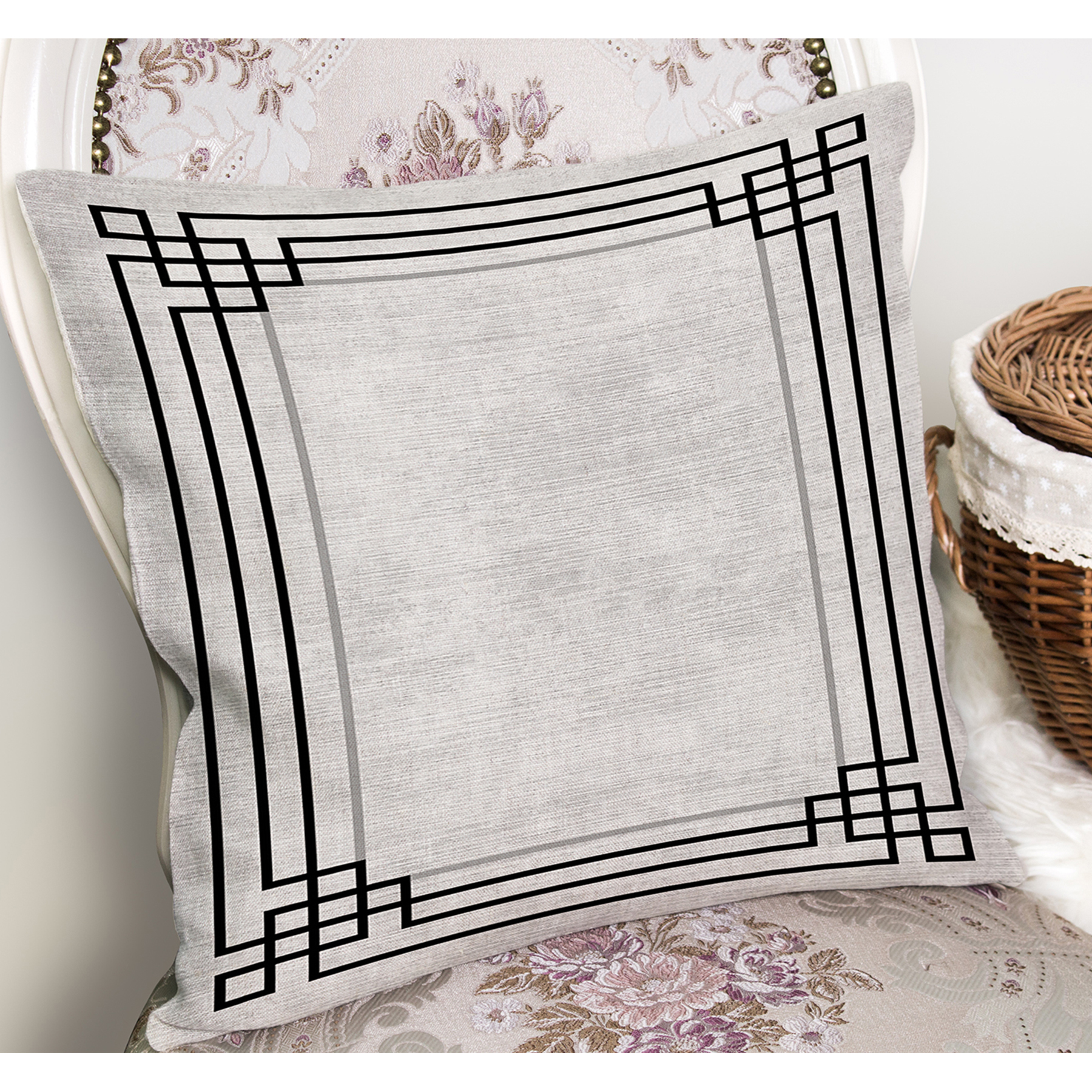 RealHomes Gri - Siyah Zeminde Çerçeveli Klasik Desenli Dijital Baskılı Yastık Kırlent Kılıfı