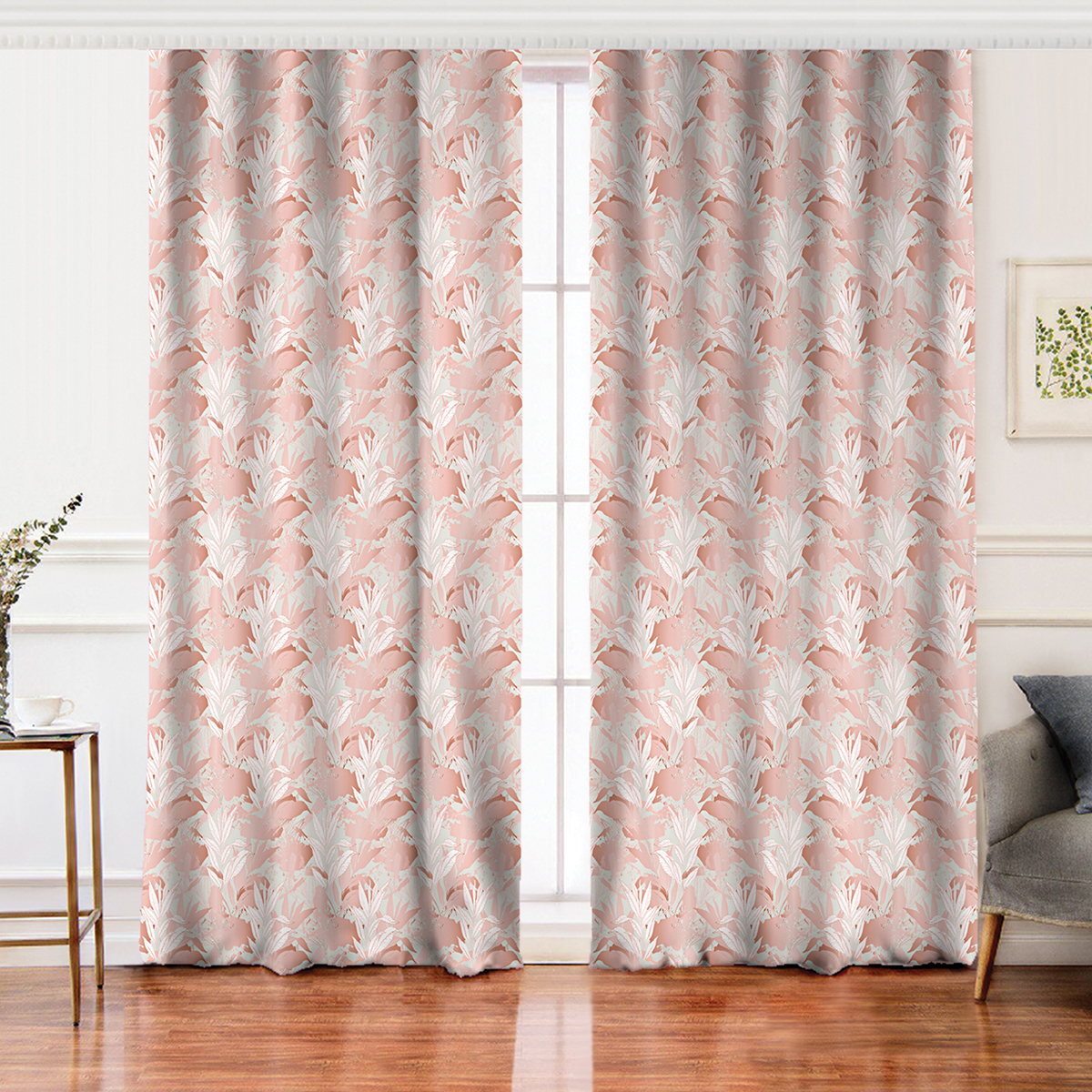Realhomes Gri Zemin Üzerinde Pembe Yaprak Motifli Özel Tasarım Salon Fon Perde