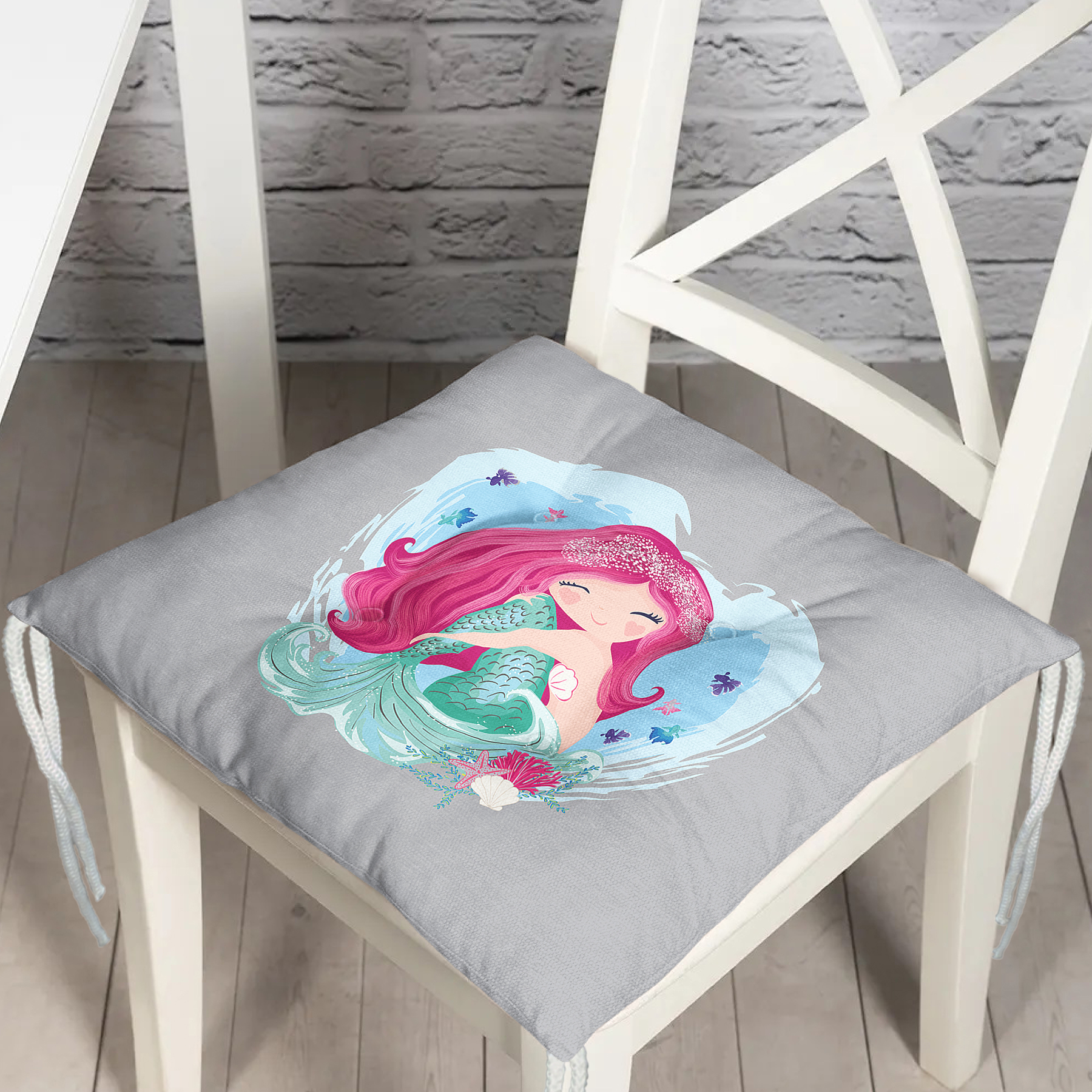 Realhomes Gri Zeminde Denizkızı Tasarımlı Dijital Baskılı Modern Pofuduk Sandalye Minderi Realhomes