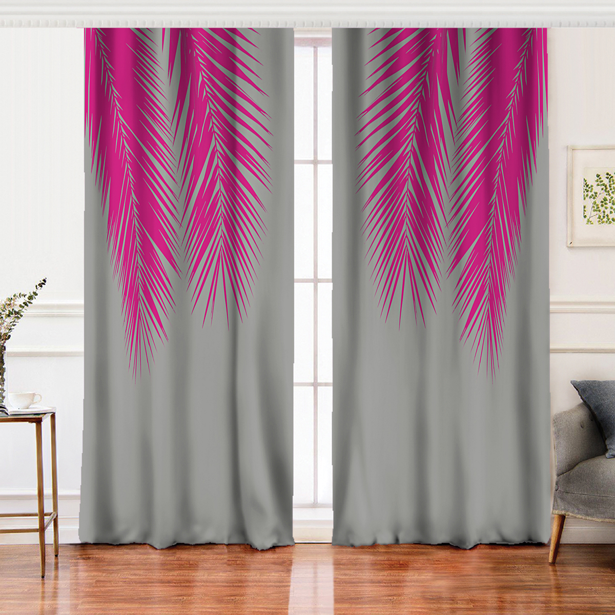Realhomes Gri Zeminde Fuşya Palmiye Yaprakları Motifli Salon Fon Perde
